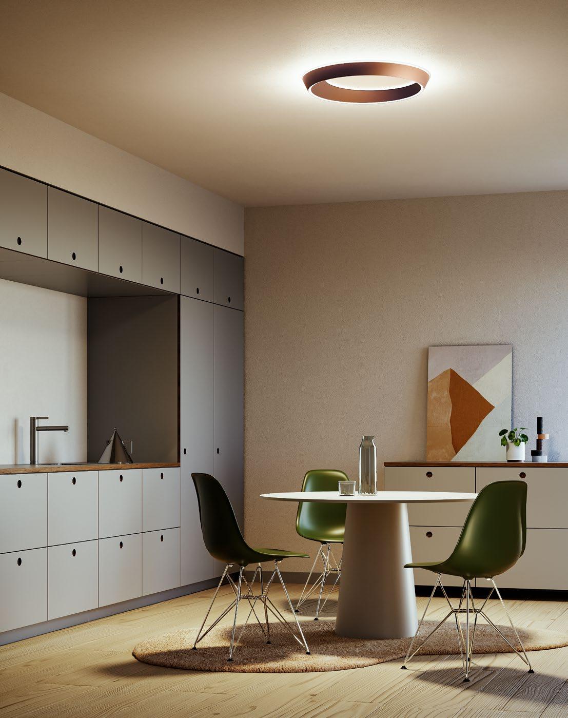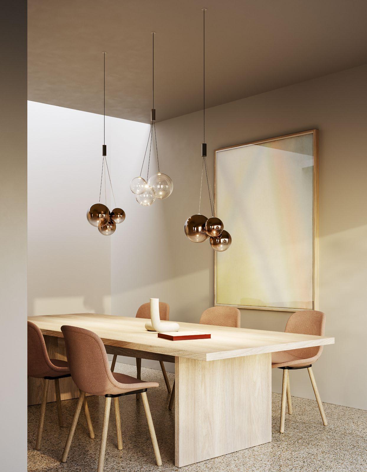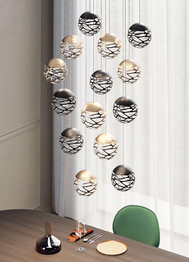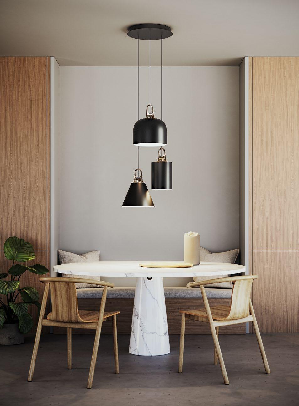 Darüber hinaus ist Elara über einen an der Wand angebrachten Dimmer stufenlos regelbar, so dass die Lichtintensität je nach Bedarf angepasst werden kann, um individuellen Beleuchtungskonzepten gerecht zu werden. Erhältlich in zwei Größen, Medium (Ø 60 cm) und Large (Ø 80 cm), eignet sich Elara für eine Vielzahl von Umgebungen, wie z. B. über einem Esstisch im Wohnbereich oder als Teil einer größeren Installation in öffentlichen Räumen, wie einer HotelLounge oder einem Restaurant. DE