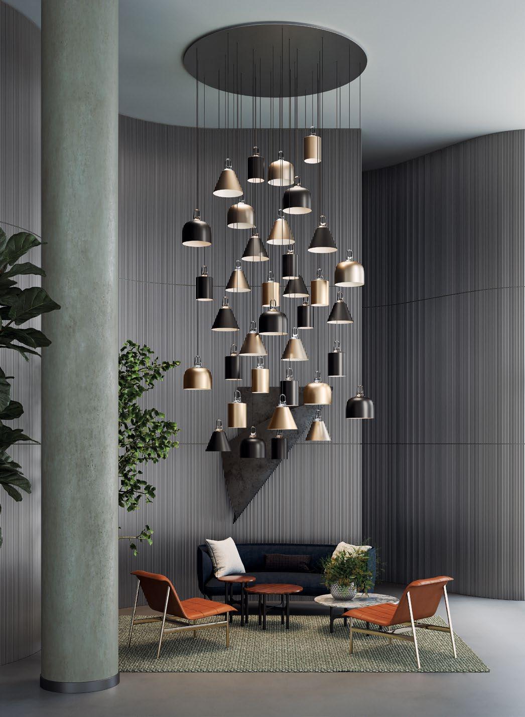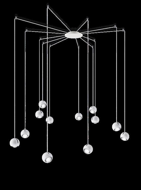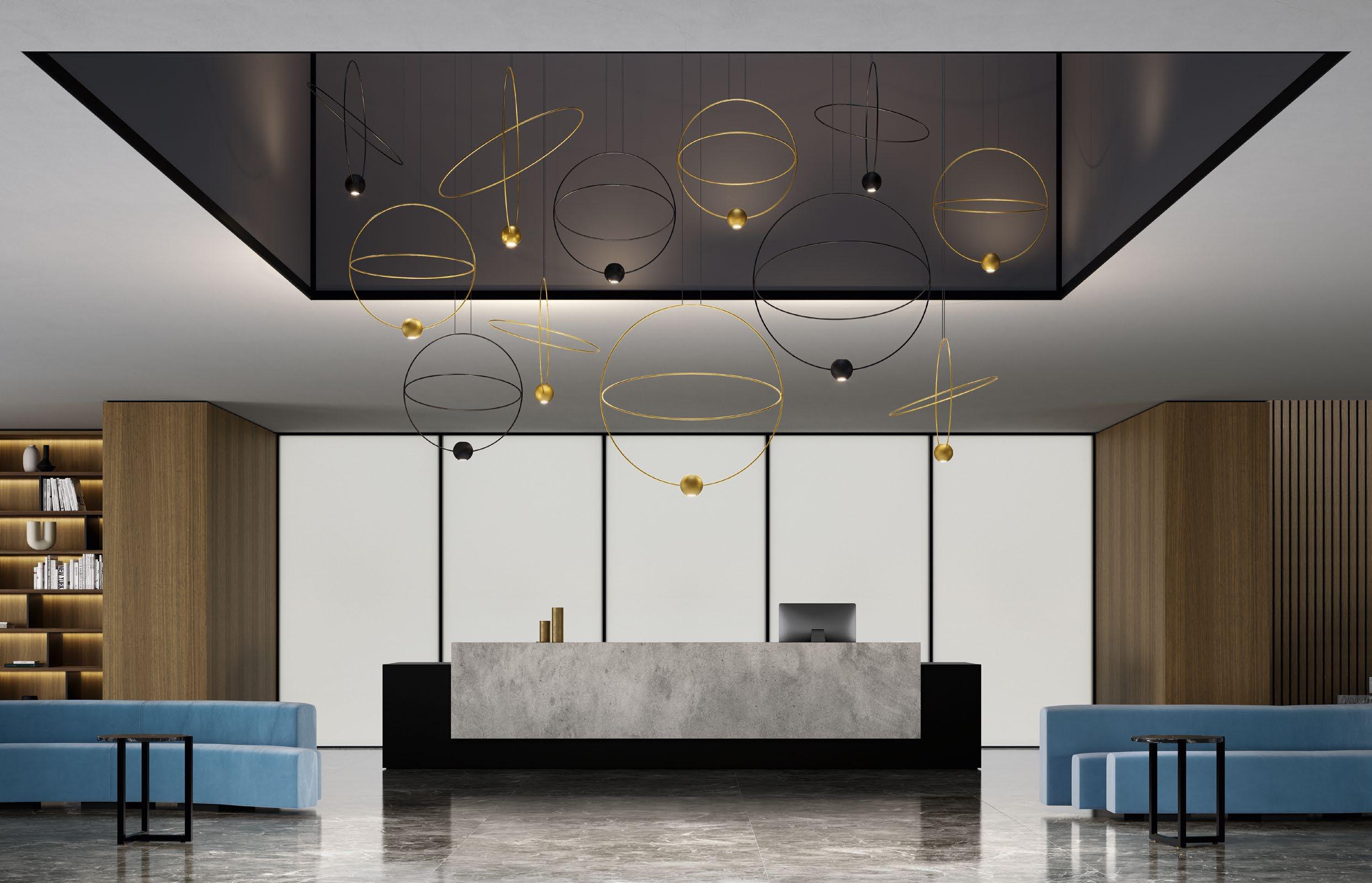 Alternatively, radial systems are an innovative way to separately manage various suspension cables starting from one single canopy, this is a particularly useful way to illuminate spaces with irregular ceilings.