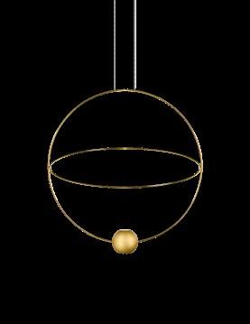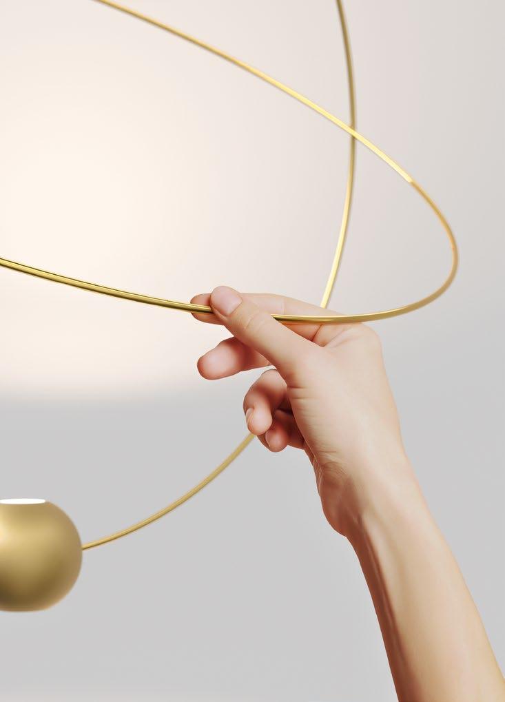 The name Elara connotes astronomy and Greek mythology, and its geometric design mimicks the trajectory of the planets within the universe. Inspired by astral motion, the lamp is characterised by two metal rings, one of which can be set at various angles to produce fluidity and movement, as well as a small sphere at the bottom of the lamp that contains the light source. The central ring can be positioned to reach different heights and angles, allowing users to experiment with casting light and shadows. Elara features a dimmer controlled with the wall-mounted power switch, allowing users to modulate the intensity of the light to create their ideal lighting scheme. Available in two sizes, medium (Ø 60 cm) and large (Ø 80 cm), Elara suits a range of environments, such as over a dining table in a residential setting, or as part of a larger installation in public spaces like a hotel lounge or restaurant.