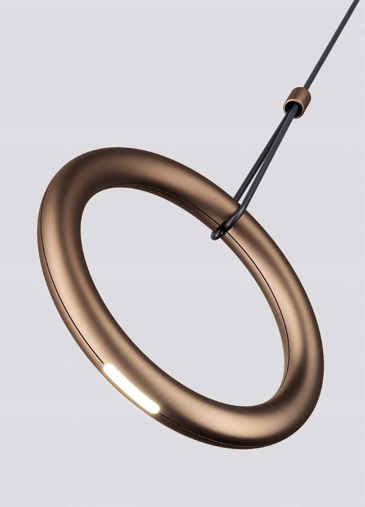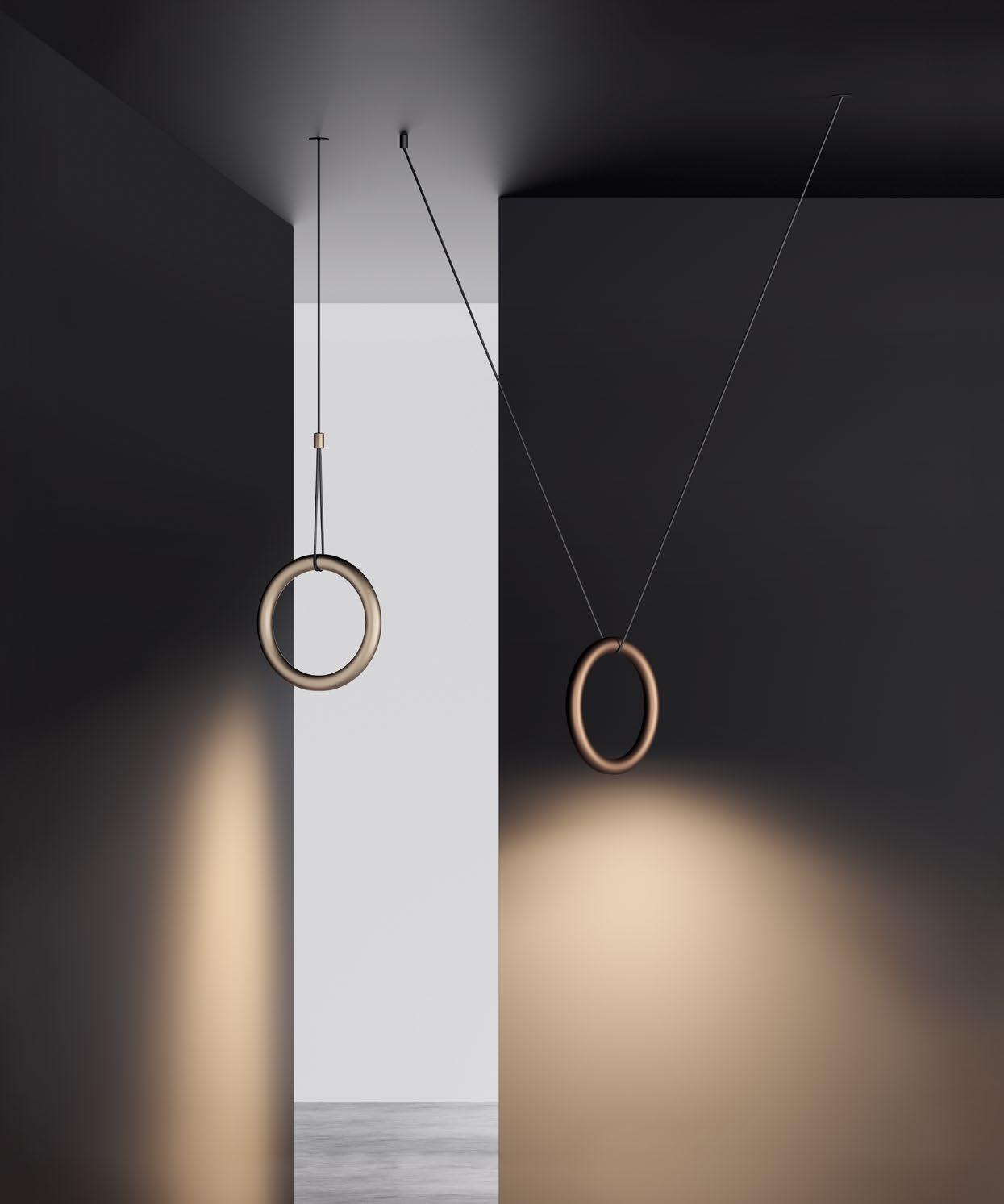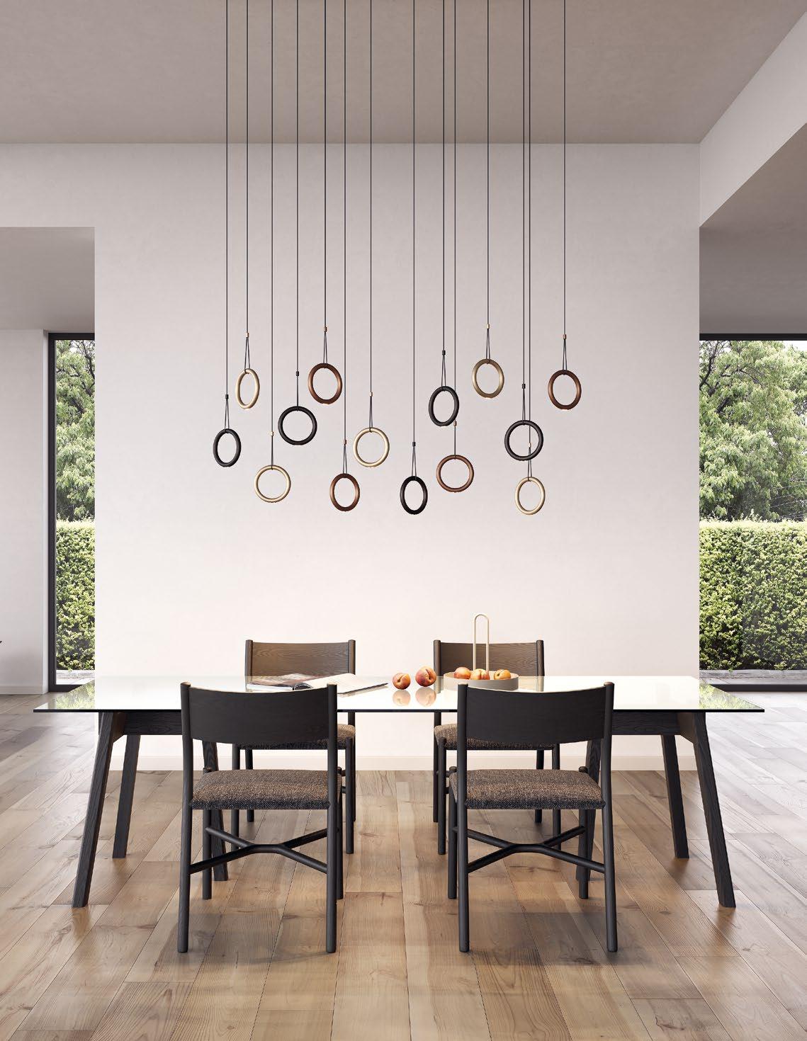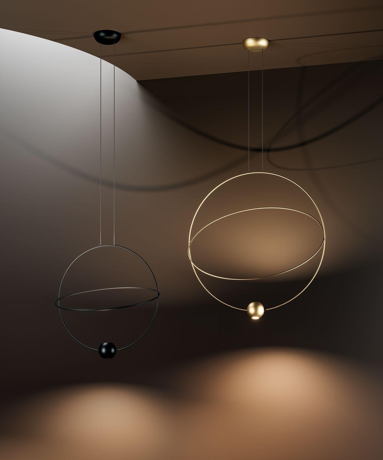 Il nome Elara richiama l’astronomia e la mitologia greca, e il suo design geometrico imita la traiettoria dei pianeti nell’universo. Ispirata al movimento astrale, la lampada è caratterizzata da due anelli metallici, uno dei quali può essere posizionato a varie angolazioni per produrre fluidità e movimento, e da una piccola sfera all’estremità inferiore della lampada che contiene la sorgente luminosa. L’anello centrale può essere posizionato in modo da raggiungere diverse altezze e angolazioni, consentendo agli utenti di sperimentare la proiezione di luci e ombre. Inoltre, Elara è dimmerabile mediante dimmer comandato dall’interruttore a parete, che consente di modulare l’intensità della luce per creare il proprio schema di illuminazione ideale. Disponibile in due dimensioni, medium (Ø 60 cm) e large (Ø 80 cm), Elara si adatta ad una vasta gamma di ambienti, come ad esempio sopra un tavolo da pranzo in un ambiente residenziale, o come parte di un’installazione più grande in spazi pubblici come la lounge di un hotel o un ristorante.