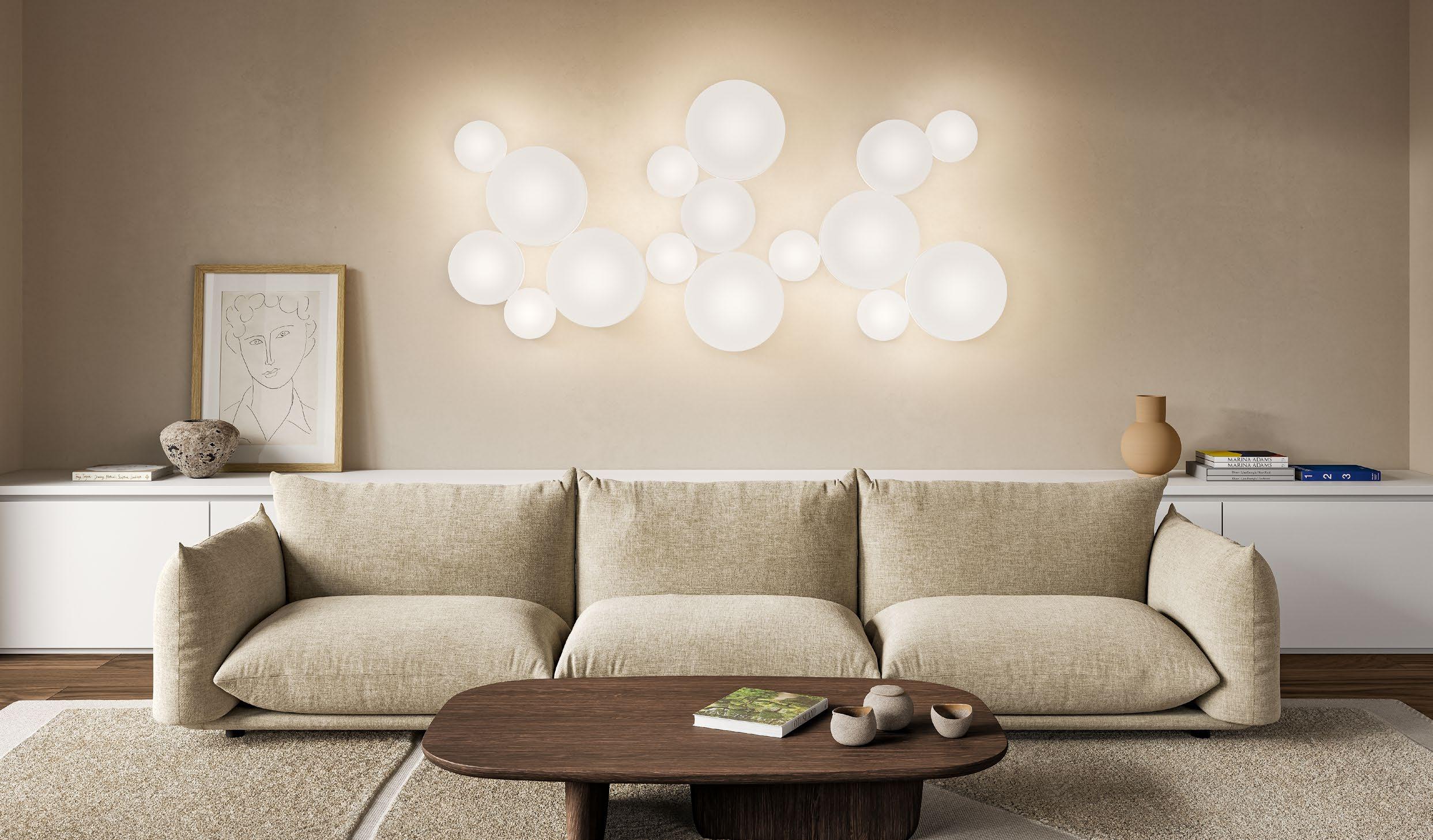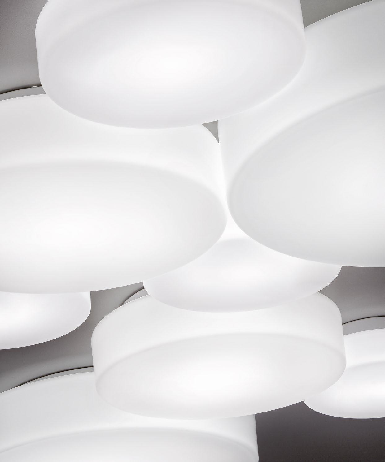 Make–Up’s design is inspired by fashion and beauty. A versatile blown glass lamp with a gentle shape, Make–Up dresses walls and ceilings with light. Elegantly functional when used individually, it acquires a highly decorative appeal in lively compositions of different sizes and volumes.