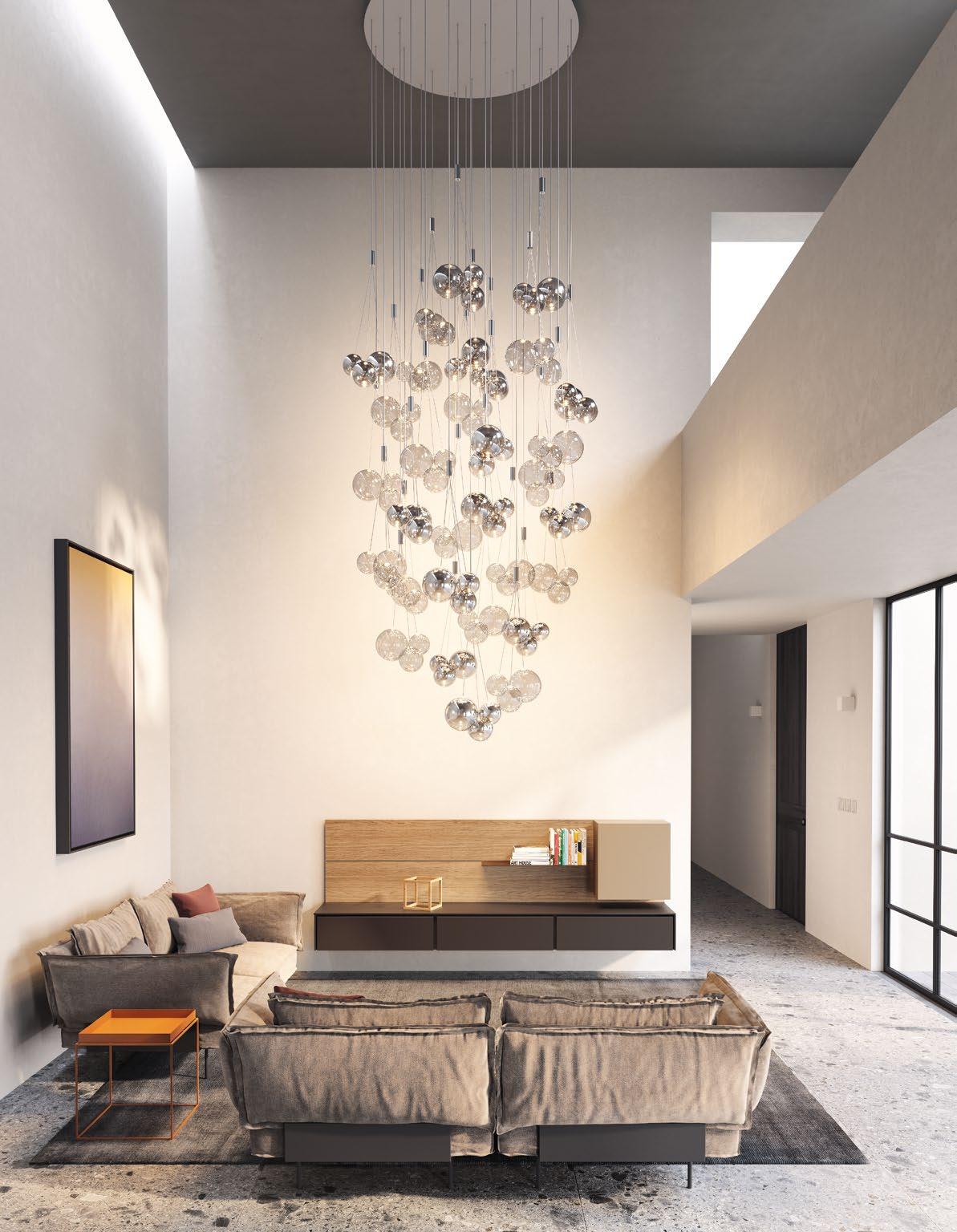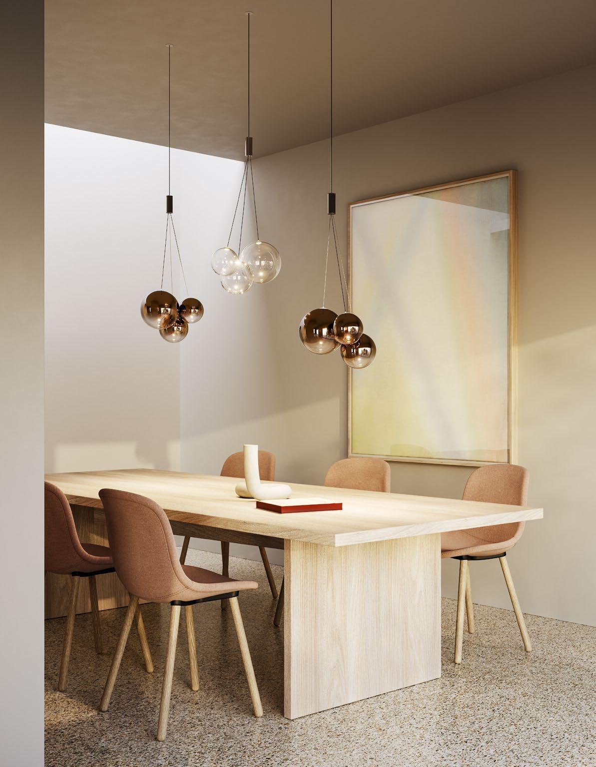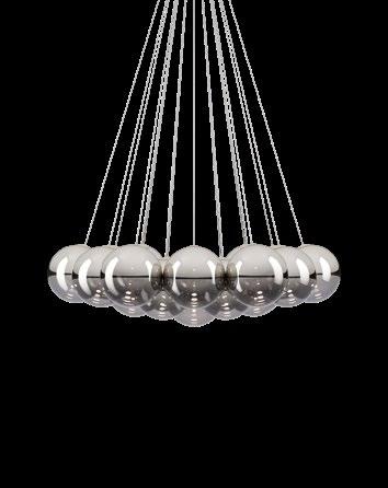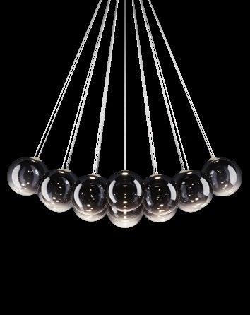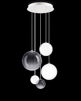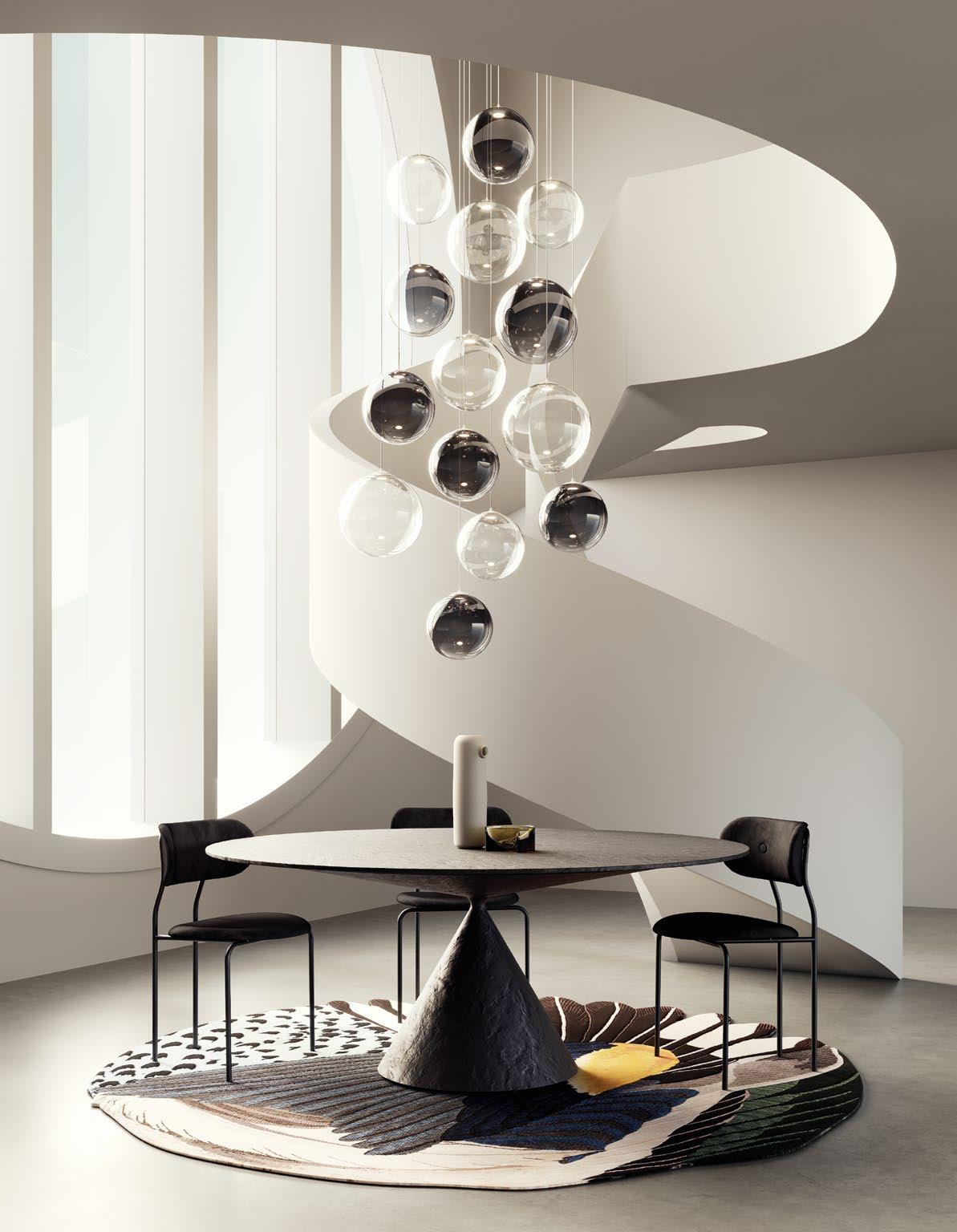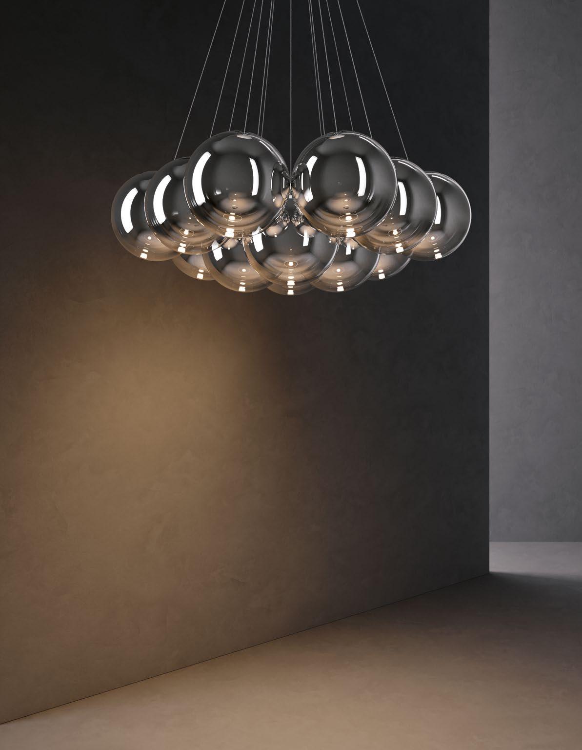 Random Cloud is a chandelier, an evolution of Lodes’ Random Solo pendant, connecting multiple glass pendants to a central canopy. The pendants can be grouped to create ‘clouds’ of 7, 14, 19, or 23 via steel cables cut to precise lengths to create distinct ‘cloud’ formations. Each composition option can be achieved with spheres 23 or 28 cm in diameter and by choosing one of seven finishes available. The wide choice of compositions and configurations available to users makes Random Cloud a versatile option for homes, hospitality venues and workspaces alike.