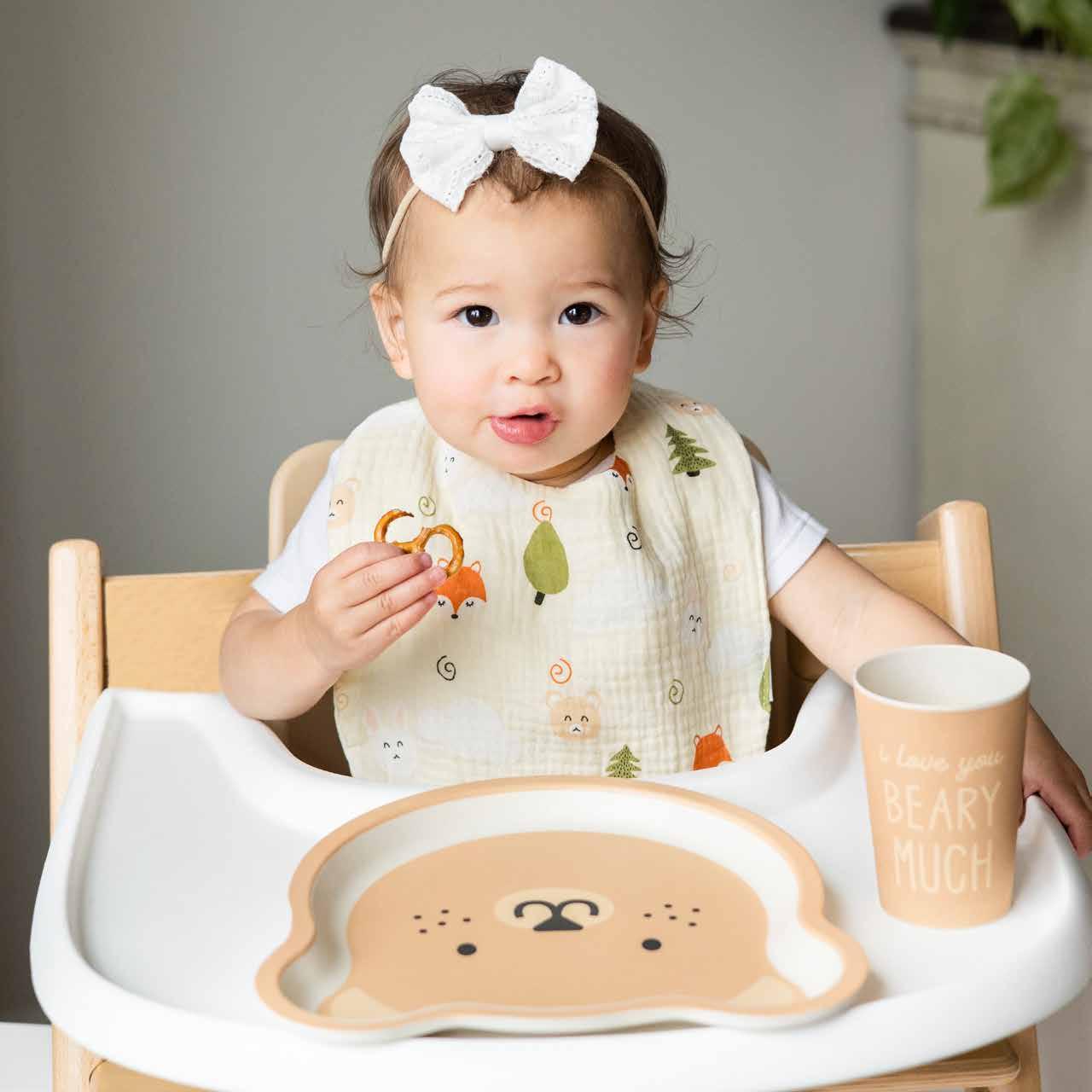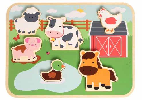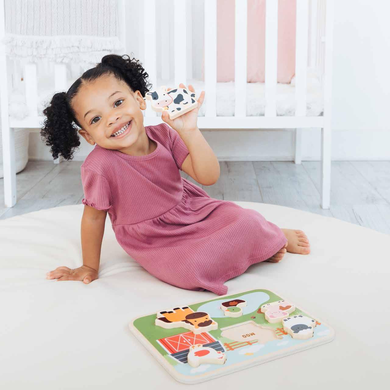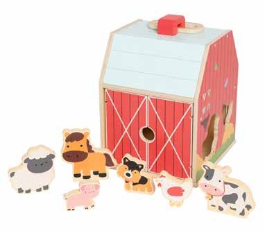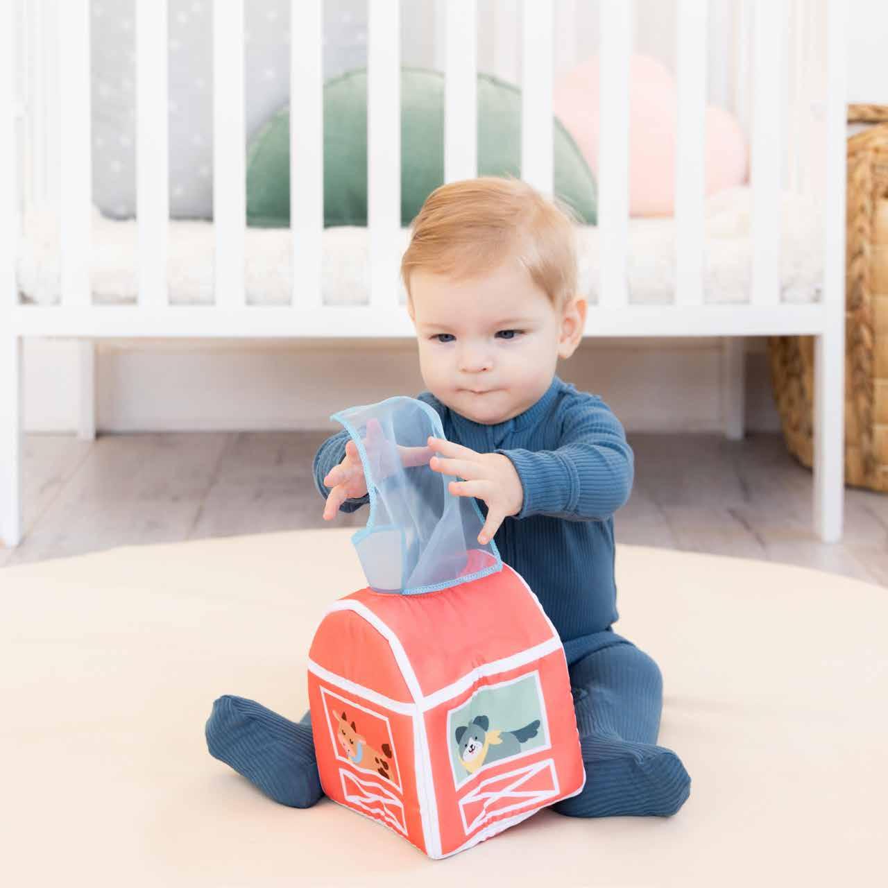 Includes 8 pieces; wooden puzzle, stacking cups, wooden teether, board book, tissue barn with tissues, flashcards