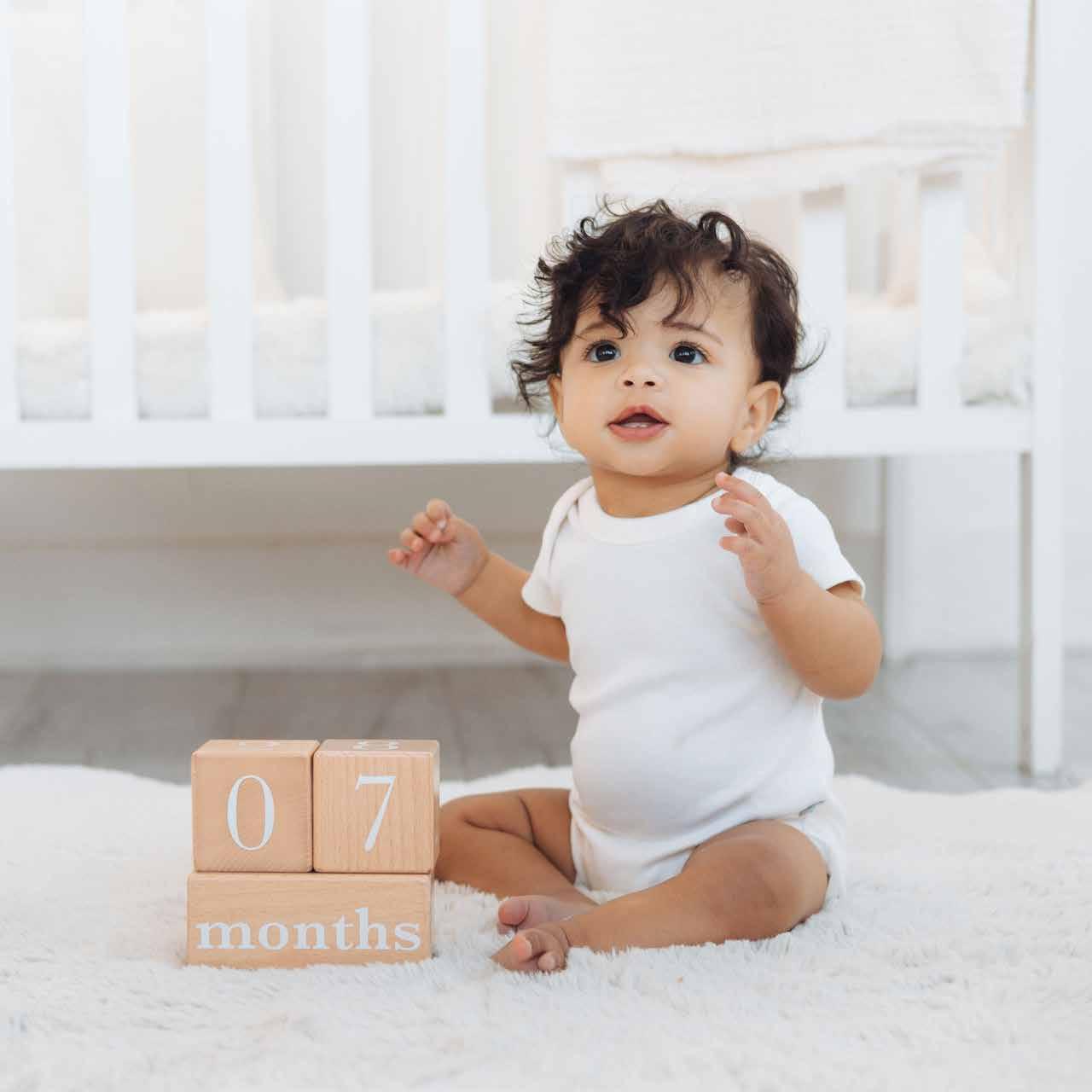 Set of 3 blocks includes numbers 0–9 and milestone phrases