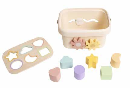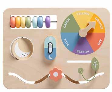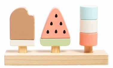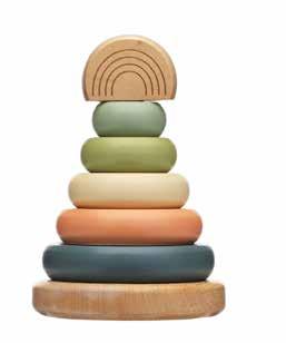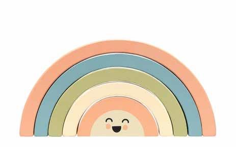 Includes 5 wooden pieces to stack and build a rainbow! 12m+