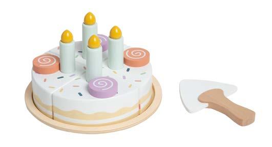 Includes a 14 piece cake play set with 4 pieces of cake, 4 candles, 4 decorative icing swirls, 1 tray, and 1 cake slicer