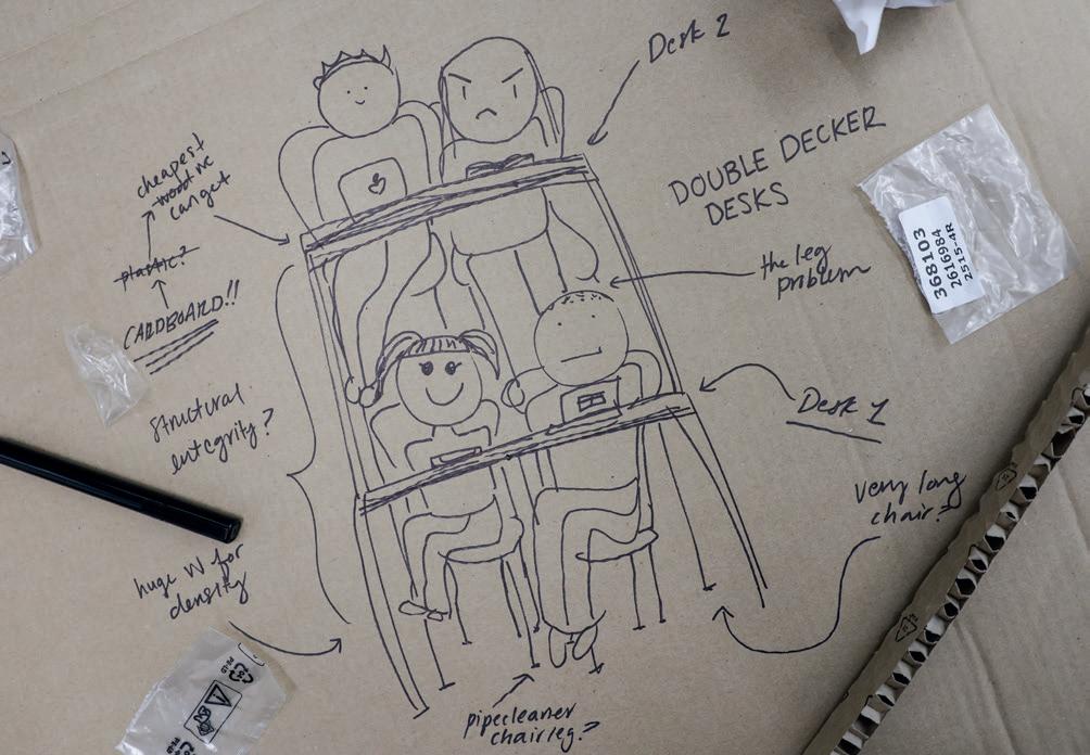 The original blueprint, drawn haphazardly on a piece of cardboard, details the SLOP Vator envisions; The second layer of furniture would be made to a much lower standard so the university could cut costs “but still double the fun,” said Vator. The Ubyssey was able to obtain a copy of the “document.”