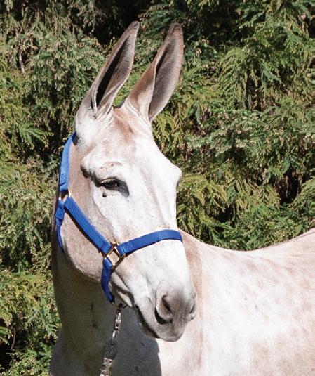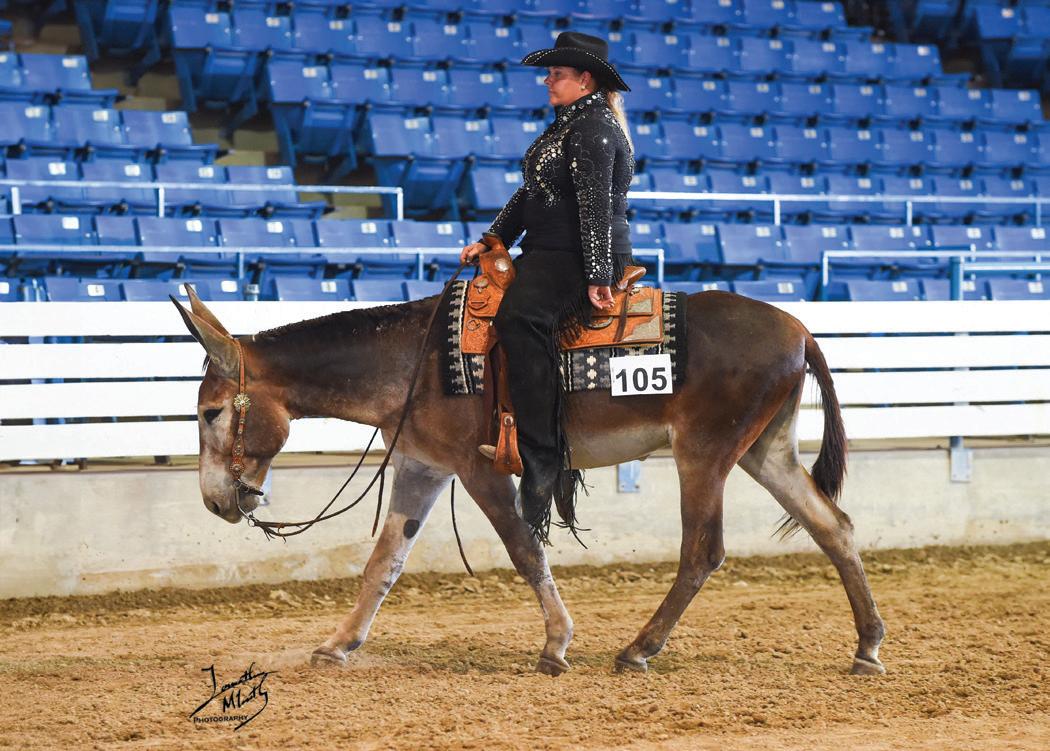 Be Gallant For Her “Eugene” is a head-turning and loyal 2023 red tobiano john mule. He is sired by NASMDA and Bishop Mule Days Hall of Fame Inductee, Clyde's Gallant Fox (Ted). Ted is a proven mule producer as a nine-time NASMDA Leading Jack and sire of multiple Bishop World Champions, NASMA National Champions, Pinto World and Congress Champions. Ted is also a top performer himself, claiming the NASMDA High Point Open Donkey title seven years in a row and holding eight superior event titles. Eugene is out of Rap Her Up, by Arapadude, who is a 3-time APHA World Western Pleasure Champion and sire of multiple APHA World and Reserve World Champion money earners. Eugene tackles new things with thought and curiosity and is always willing to try when given the time to think about what’s asked of him. He is always eager to learn and explore new things head on. His friendly and in your pocket demeanor makes him a mule that just wants to please. On top of his winning personality and bloodlines, his solid and correct build and flashy markings make him the all-around perfect mule. His trainer’s favorite thing about working with him is the personal connection she has made with him throughout training, as he is always excited to see her at the gate and ready for any project they are working on.