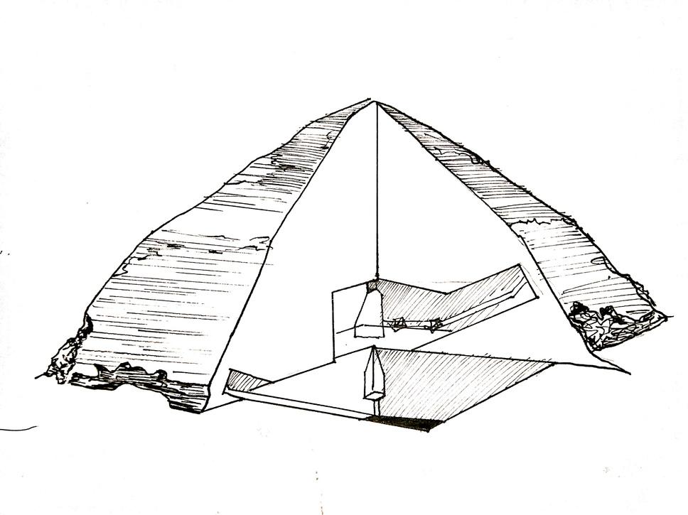 Kim Tự Tháp 2 dốc đánh dấu một bước chuyển tiếp từ Kim Tự Tháp bậc thang qua Kim Tự Tháp hình chóp Kim Tự Tháp này có hai độ dốc: phần dưới độ dốc 54 độ 15 phút, phần uốn cong bên trên là 47 độ. Công trình kéo dài hơn 20 năm và huy động nhân lực và vật lực rất lớn Có hai lối vào bên trong Kim Tự Tháp Lối thứ nhất nằm ở mặt phía Bắc, cách mặt đất khoảng 12 m dẫn đến gian phòng ở trên. Lối thứ 2 nằm ở mặt phía Tây chỉ cao hơn mặt chút út, dẫn xuống gian phòng bên dưới Cả hai gian phòng này có kết cấu sàn bằng đá khối dày 4 m nơi chứa quan tài lối vào nơi chứa quan tài