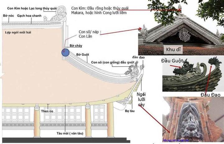 Bờ nóc hơi võng, có khi 2 đầu nhô cao vút ra ngoài như hình con thuyền lớn. Trên 2 đầu bờ nóc được đắp hình con Kìm Lạc long thủy quái, ở giữa bờ nóc hình lưỡng long chầu nguyệt (hình thức này sang thời Nguyễn mới thịnh hành), bờ chảy đắp các con xô lân, phượng…