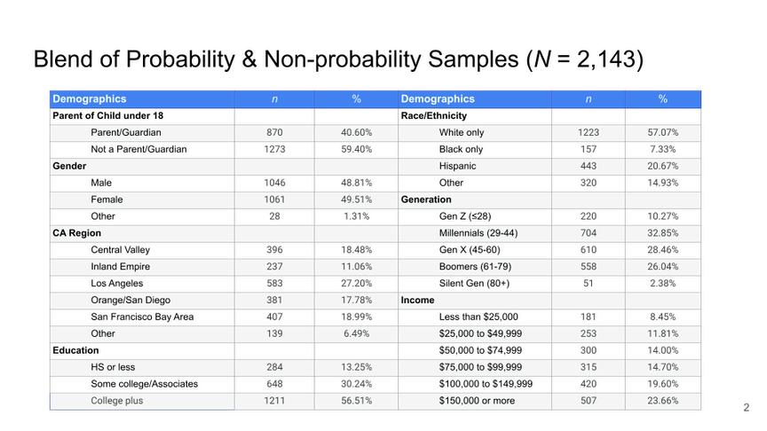 Data were collected using a hybrid sampling approach that blended a probability sample from the California voter file (n = 478) with a non-probability sample from a large online panel administered by Dynata (n = 1,665). Parents and guardians of children ages 0 through 17 (n = 870) were oversampled.