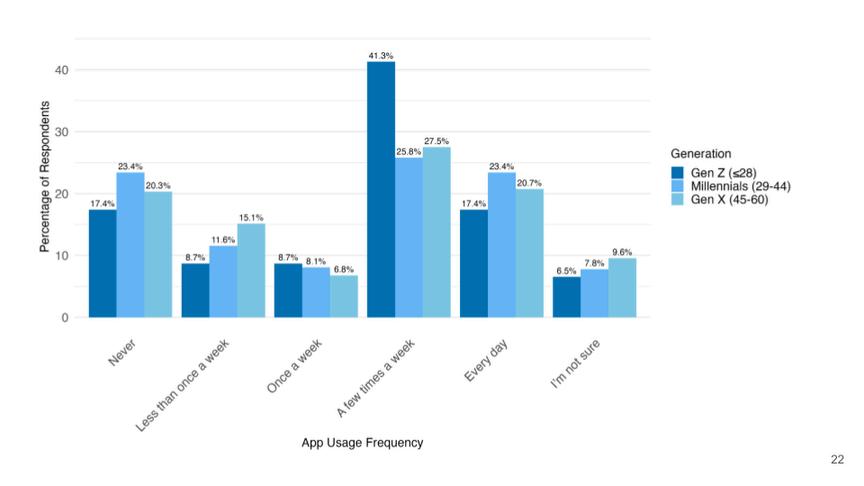 Gen Z parents reported that their children used generative AI more frequently than children of Millennial and Gen X parents, with 41% indicating their children used generative AI a few times a week, compared to 26-27% of Millennial and Gen X parents This difference remained even after accounting for the children’s age