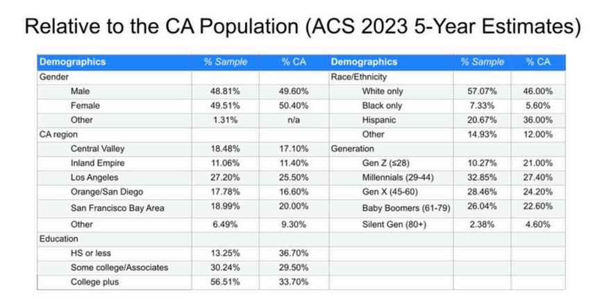 The sample was largely representative of the CA population, with the exception of an overrepresentation of college-educated, White, and non-Gen Z adults.