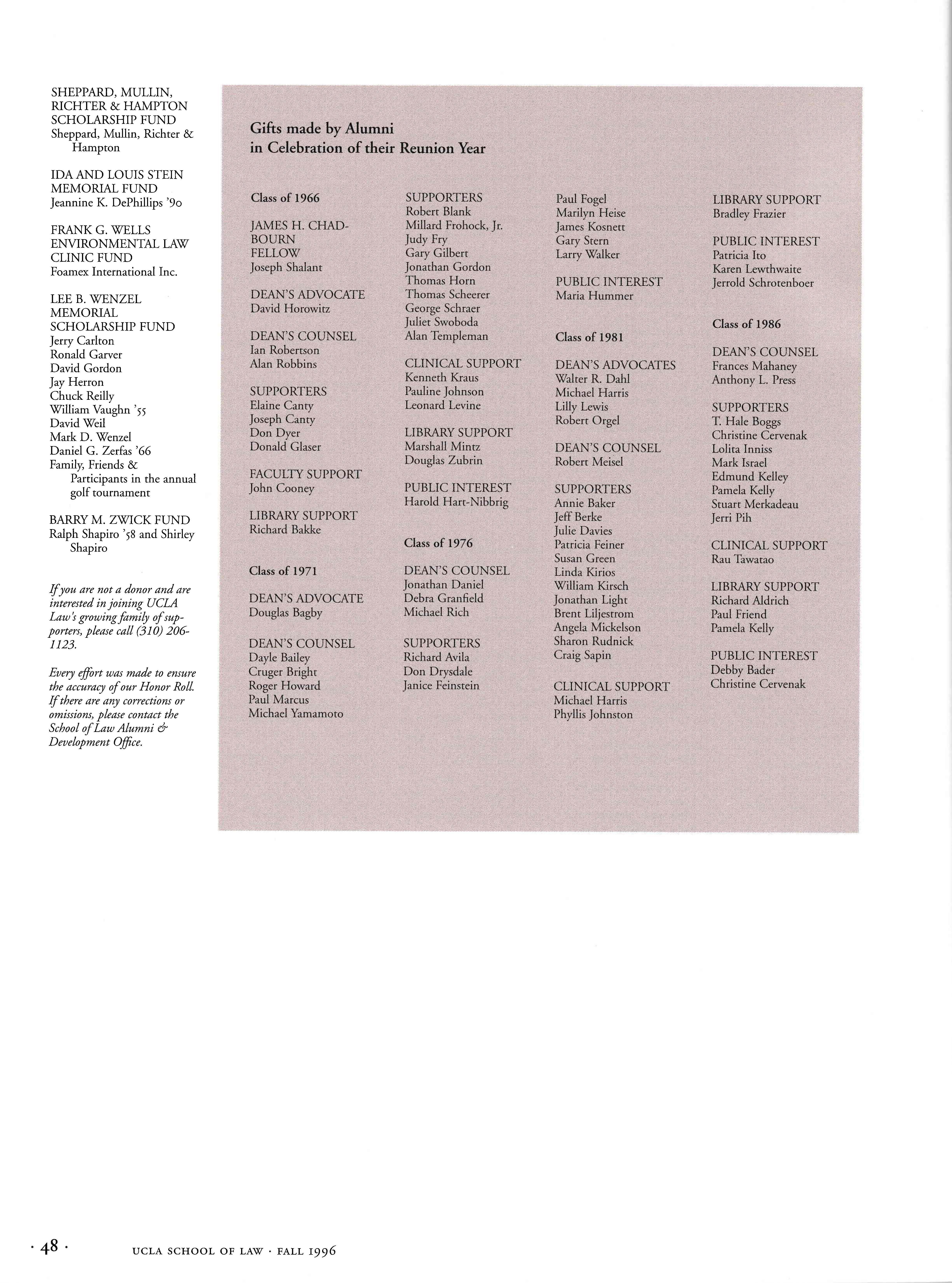 Steinman was a generous supporter of UCLA and its law school. He was a member of the Chancellor's Associates, and he was among the alums who came forward to create the Richard C. Maxwell Chair in recognition of former Dean Maxwell.