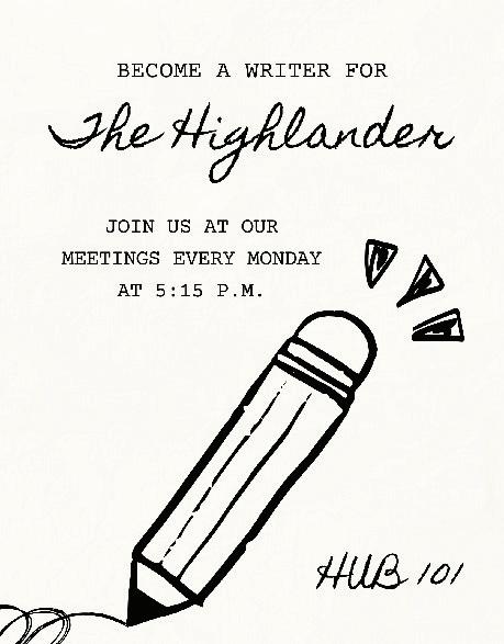 The Highlander Newspaper is a great way to keep up with current events and news around campus. If you are interested in the newspaper’s articles or pictures, we offer opportunities in writing, photography and design. Join us every Monday at 5:15 p.m. in HUB 101 to learn more.