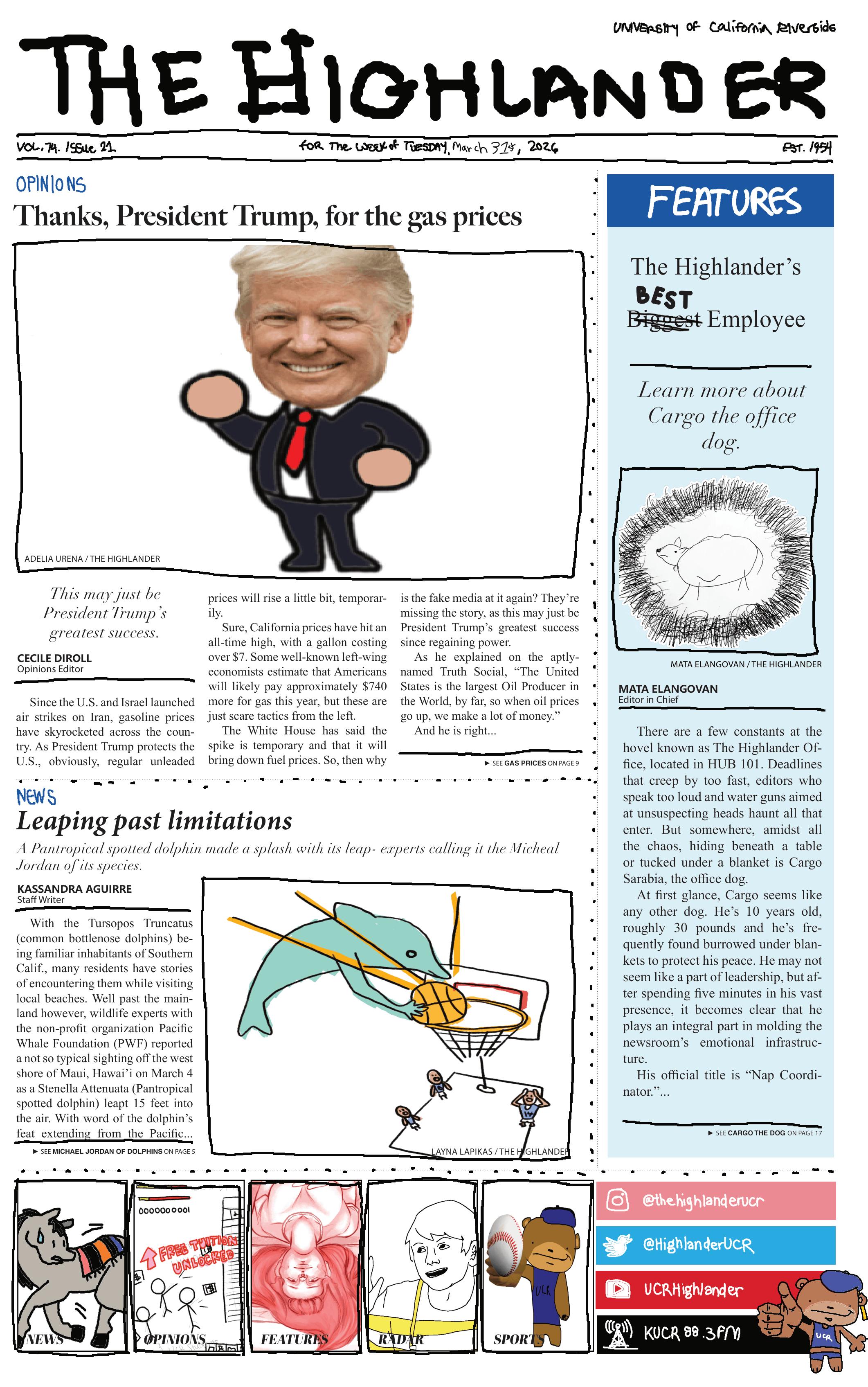 The Highlander is published and copyrighted by the Highlander for the students, faculty and staff of UCR. All rights are reserved. Reprinting of any material in this publication without the written permission of the Highlander is strictly prohibited. Readers are allowed one free copy of the newspaper. For additional copies or for subscription information, please contact the Highlander. The Highlander fully supports the University of California’s policy on nondiscrimination. The student media reserve the right to reject or modify advertising whose content discriminates on the basis of ancestry, color, national origin, race, religion, disability, age, sex or sexual orientation. The Highlander has a media grievance procedure for resolving complaints against it. All inserts that are printed in the Highlander are independently paid publications and do not reflect the views of the Editorial Board, the staff or The University of California or the Associated Students of UCR.