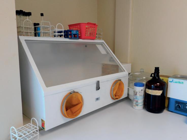 • Laboratorio de bioensayos, cuenta con equipamiento para la mantención de organismos bajo criterios estándar de ejecución de ensayos. Por ejemplo, balanza analítica, multiparámetros, campana extractora, microscopios, cámaras de cultivo, incubadores, baños termorregulados, autoclave, entre otros.
