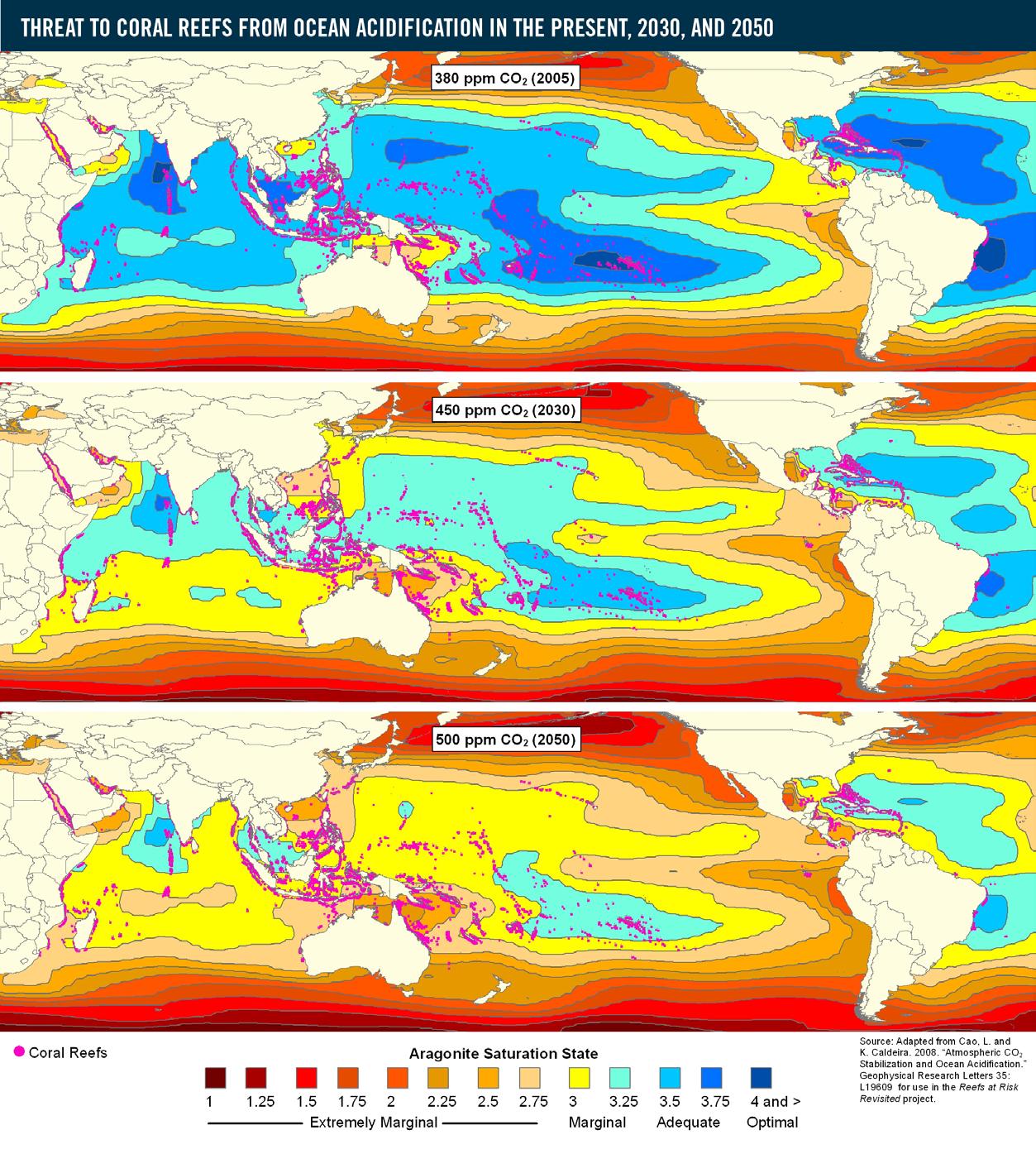 Los datos fueron adaptados de Cao, L. y Caldeira, K. (2008). «Estabilización atmosférica de CO2 y acidificación del océano». Geophysical Research Letters 35: L19609, para su uso en el proyecto revisitado de Arrecifes en Riesgo2.