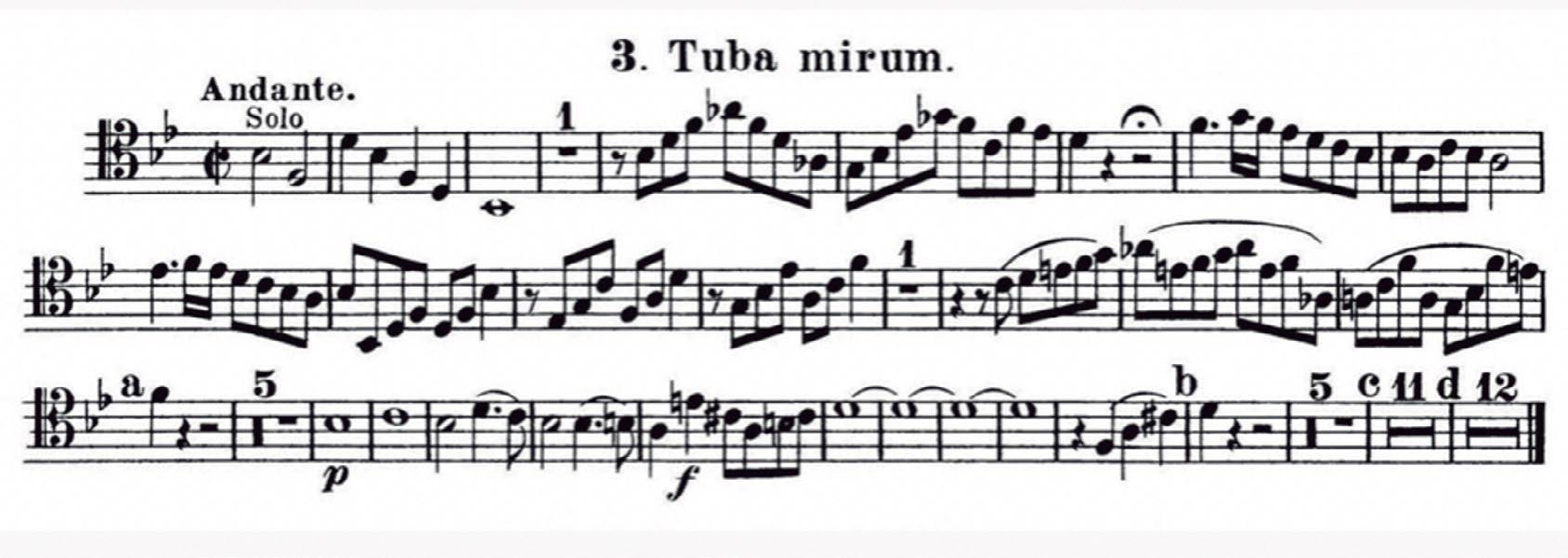 El uso del trombón en el inicio del movimiento Tuba Mirum tiene un sentido totalmente programático e incluso teológico, debido a que parte del verso del poema «Tuba mirum spargens sonum per sepulcra regionum coget omnes ante thronum» frase que significa «La trompeta, esparciendo un sonido admirable por los sepulcros de todos los reinos, reunirá a todos ante el trono», la cual hace alusión al apocalipsis y al uso de las siete trompetas tocadas por los ángeles de la hecatombe. El primer tema del verso inicia con el uso de siete notas haciendo referencia a las siete trompetas del fin de los tiempos, reforzado en el tercer compás con la repetición del tema por parte del solo del cantante del bajo.
