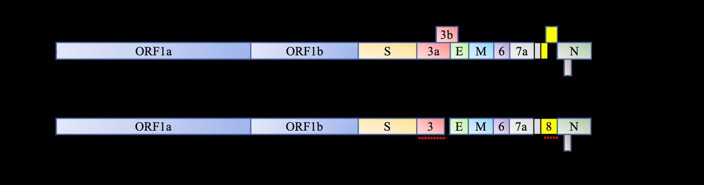 Estructura de los arns de sars-CoV y de sars-CoV-2. Se resalta en líneas punteadas (rojo) las secuencias que generan proteínas con más diferencias (UTR = región no traducida, por sus siglas en inglés) (adaptado de Shereen et al., 2020; Perlman y Netland, 2009).