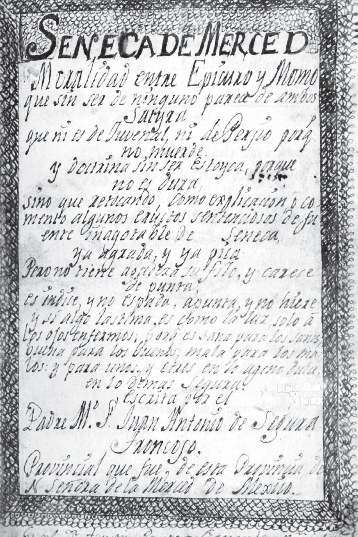 nicipales, etcétera, según la historia de cada nación) europeas grandes epistolarios organizados* y demás géneros considerados «genuinamente» literarios (según los parámetros anacrónicos de los formalistas rusos y secuaces), pero sí algunos géneros cuya circulación a veces se limitó a ese estado, como los manuscritos poéticos o los textos relativos a la actividad docente, a menudo relacionados con la actividad universitaria (Pérez Puente, 2000).¶Sin embargo, cabe destacar para empezar que en ninguno de los tres casos que mencionaré aquí se invalida por completo el certero diagnóstico que estableció José María Vigil, director de la Biblioteca Nacional a partir de 1880: para el erudito, «el elemento dominante [de los fondos de la Biblioteca Nacional] era el teológico en proporción de dos terceras partes del número total de volúmenes», pero había que precisar que «resultaba pertinente su conservación como “monumento de actividad intelectual durante una larga serie de siglos”» (apud Villagómez, 2006). Aunque de alguna forma parece escapar a esta regla es Juan Antonio Segura y Troncoso, autor que las historias de la literatura colonial suelen olvidar a pesar de los múltiples intereses que presentan su vida y obra, pues de las tres obras suyas manuscritas que hoy se conservan en la Biblioteca Nacional de México sólo una –titulada, según Yhmoff, Libri tres summularum et Tractatus in logicam Aristotelis Doctoris angelici doctrinam continens (Yhmoff, 1975), una compilación de textos filosóficos– está relacionada con la actividad teológica universitaria, mientras que las otras dos, que sin embargo también proceden de los fondos del Convento de la Merced, pertenecen a géneros más lúdicos: el Séneca de Merced y sus Poemas varios, podemos sin duda considerar que