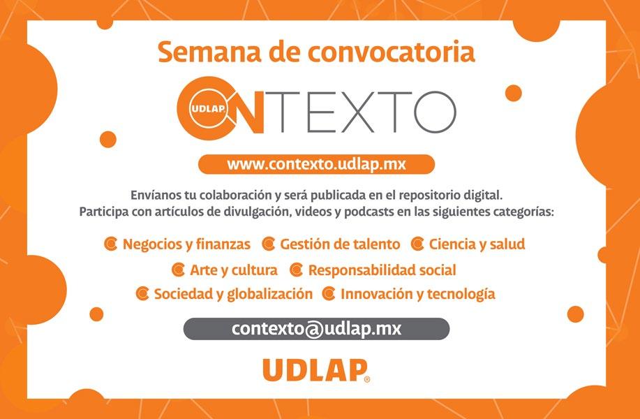 CONEXIÓN, Año 3, núm. 12, 2022, es una publicación trimestral editada por la Fundación Universidad de las Américas, Puebla. Ex hacienda Santa Catarina Mártir s/n, San Andrés Cholula, Puebla, C. P. 72810. Tel. 222 229 20 00. www.udlap.mx, lorena.martinez@udlap.mx. Editora responsable: Lorena Martínez Gómez. Reserva de Derechos al Uso Exclusivo e issn: en trámite, ambos otorgados por el Instituto Nacional del Derecho de Autor. Licitud de Título y Contenido: en trámite, otorgado por la Comisión Calificadora de Publicaciones y Revistas Ilustradas de la Secretaría de Gobernación.