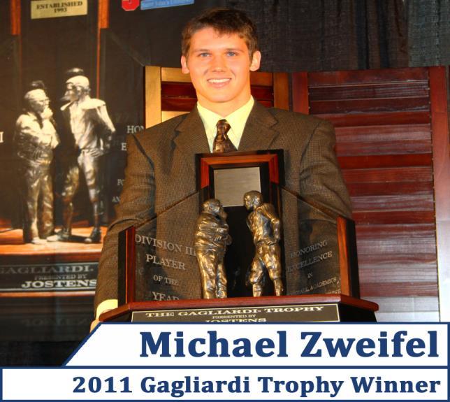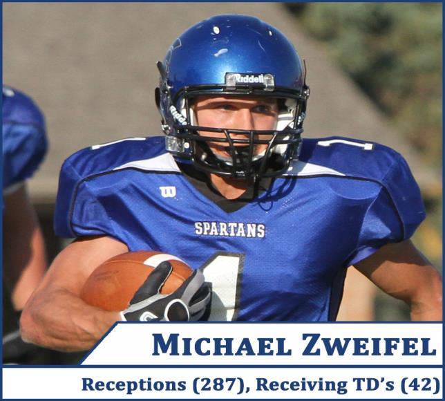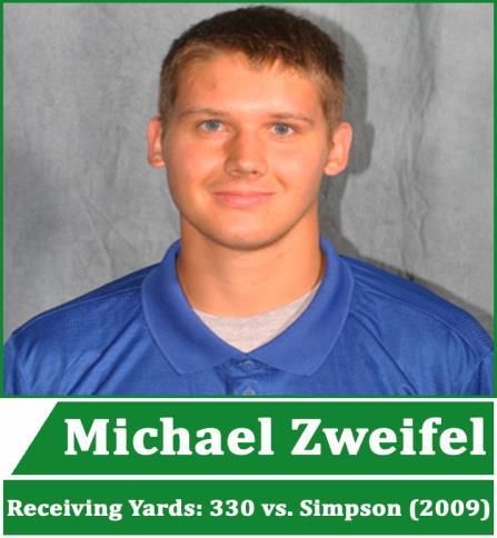 1. Michael Zweifel 140 2011 1. Michael Zweifel (2009-11) 287 2. Michael Zweifel 111 2009 2. Matt Plummer (1996-99) 271 3. Matt Plummer 86 1996 3. John Smith (1965-68) 171 4. Roger Little 79 1988 4. Tyler Rutenbeck (2011-14) 163 5. Austin Morgan 73 2012 5. Demacus Fleming (2008-11) 160 6. John Smith 72 1966 6. Emanuel Jenkins (2016-19) 156 7. Dave Bacon 68 1965 7. Chris Bagley (2012-15) 153 8. John Smith 68 1968 8. Sean Anderson (2010-13) 150 9. Sean Anderson 68 2012 9. Daunta Peterson (2002-05) 149 10. Tyler Rutenbeck 68 2013 10. Edward McIntosh (2005-08) 145 ^ Zweifel set Division III record in 2011 ^ Zweifel set NCAA record with 463 receptions ^ Zweifel led the NCAA in 2011 ^ Plummer ranks 20th in D3 history with 271 receptions ^ Zweifel finished 2nd in Division III in 2009