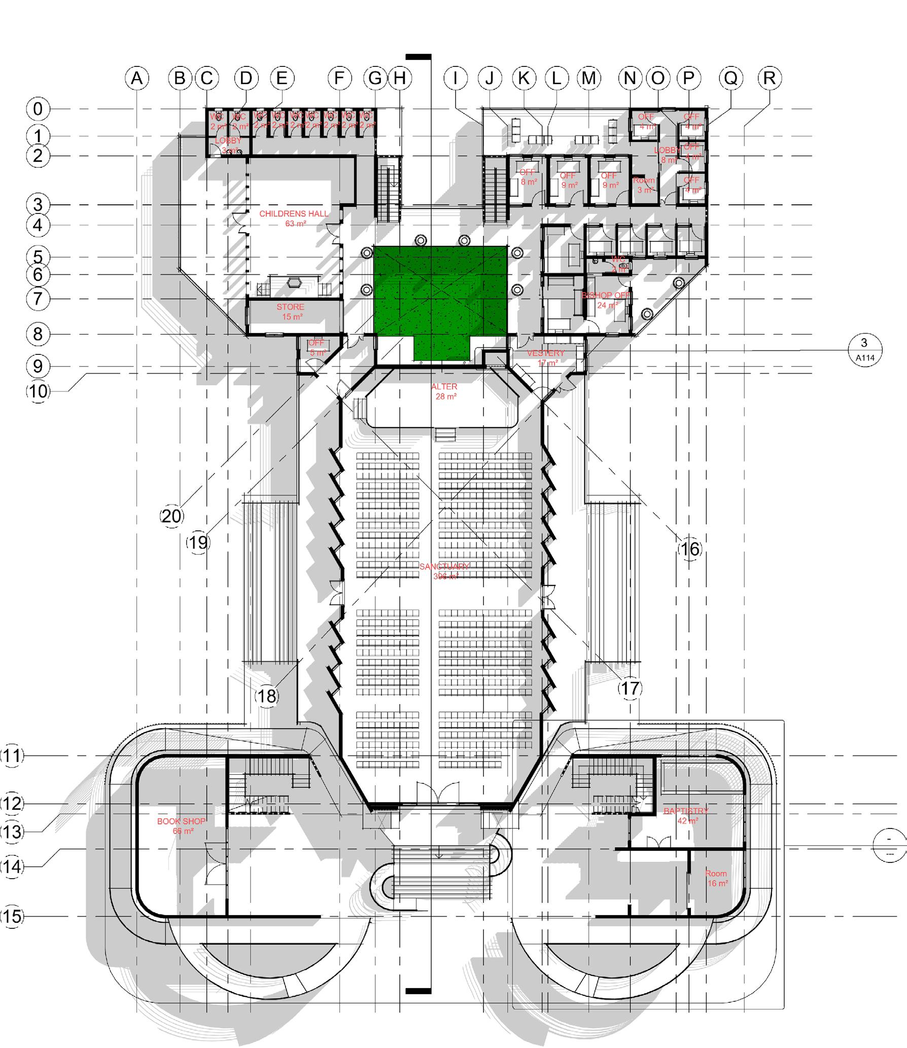 THE SLANTING WALLS SERVES AS A LIGHT FUNEL. BEYOUND THE SANCTUARY IS THE ADMINISTRATIVE ZONE. THIS HOUSES OFFICES OF THE PRESBYSITES, PASTORS AND THE BISHOP.ON THE LEFT SIDE IS THE AUDITORIUM FOR CHILDREN MASS.