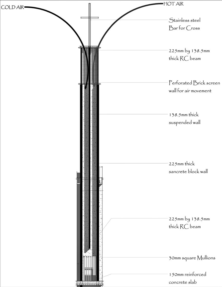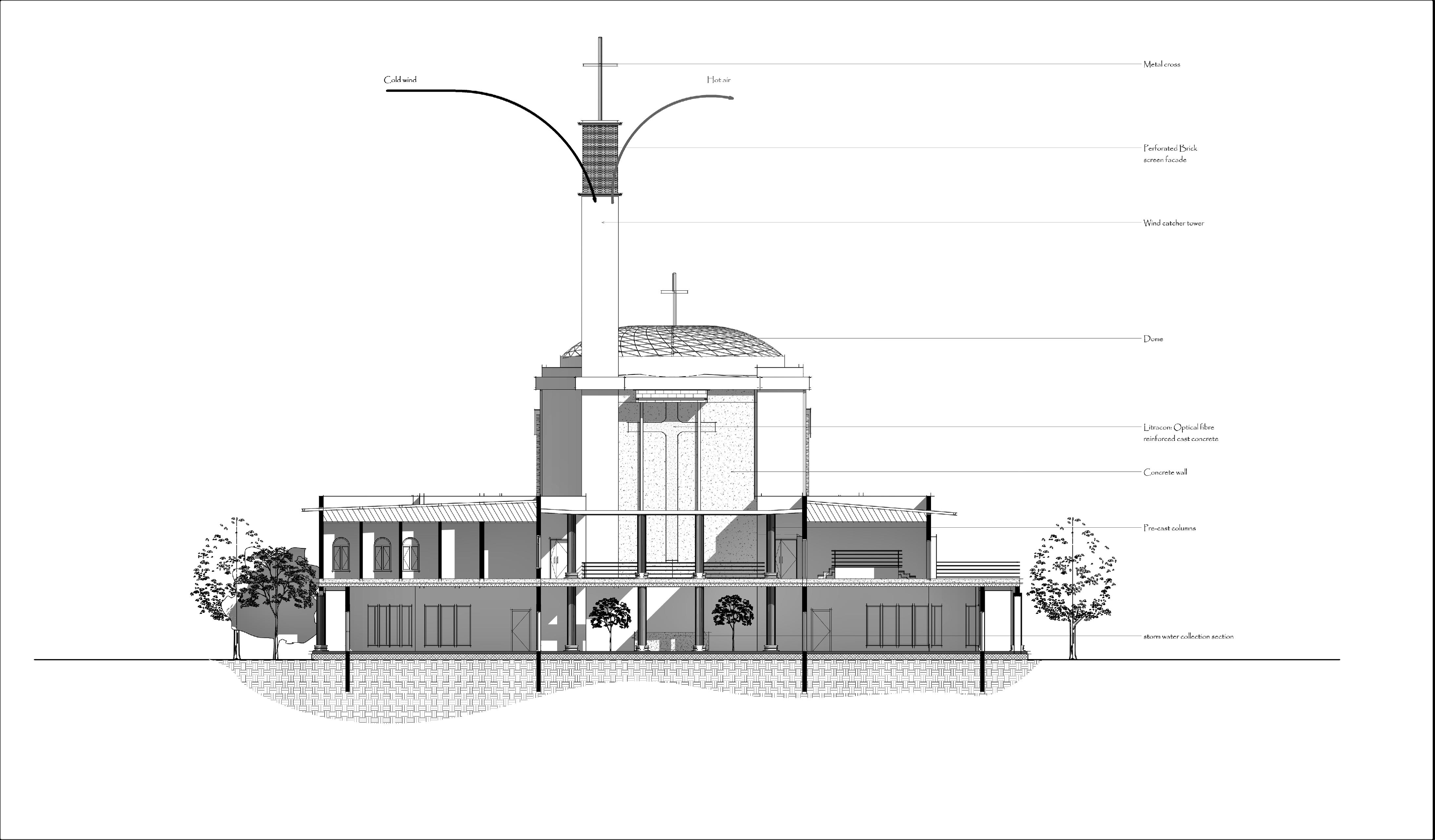 INSPIRED BY THE EGYPTIAN AND IRAN ARCHITECTURE IS THE WIND CATCHER.WITH THIS, THE TYPICAL TOWER SEEN IN CHRISTAIN CHURCHES AND CATHEDRALS TENDS TO HAVE MORE FUNCTION. THE TOWER DRAWS IN COOL AIR FROM THE ATMOSPHERE AND CHANNELS IT INTO THE CATHEDRAL AND TAKES IT OUT AS HOT AIR THROUGH THE DIFFERENCE IN AIR PRESSURE.