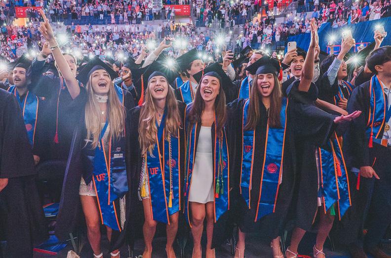 Engineering graduates light up the arena as they sing along to Tom Petty’s “I Won’t Back Down” during the Spring 2025 University of Florida commencement ceremony — a beloved Gator tradition.