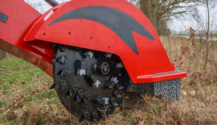 Ā Veilig werken, voorste klep is hydr. te openen, voor een optimale werking, en minnimaal wegspatten van het gefreesde materiaal, achterzijde minimaliseert een dubbele rij zware kettingschakels het wegspatten