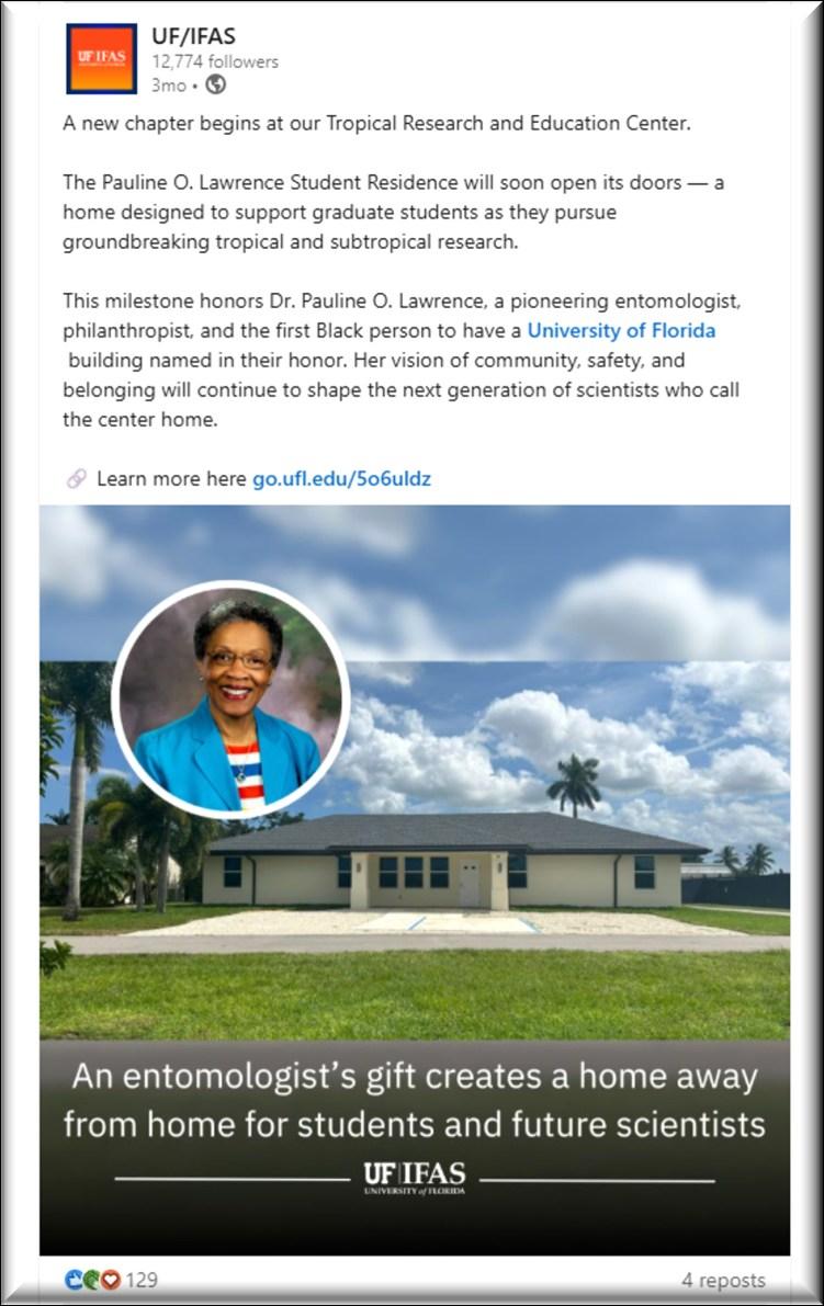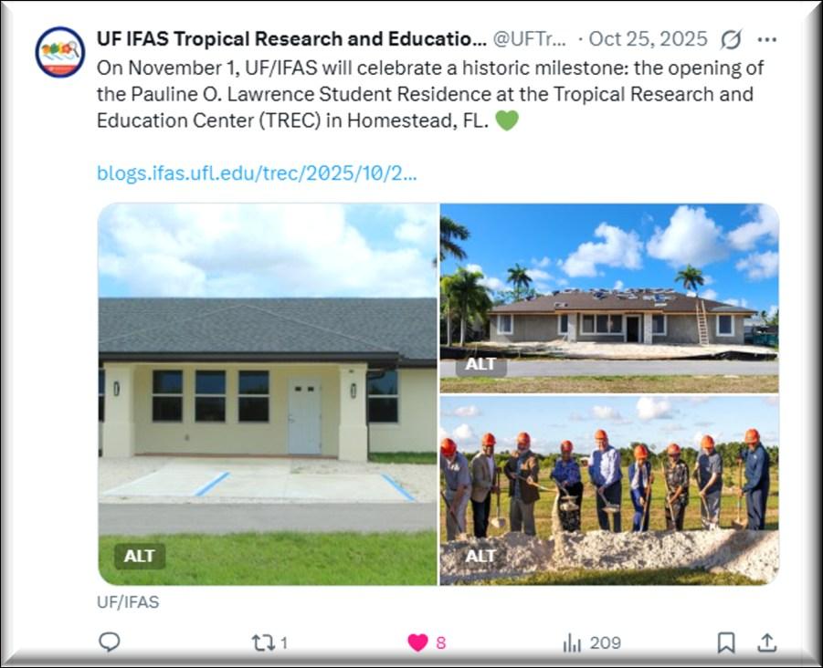 On November 1, the UF/IFAS Tropical Research & Education Center hosted the longawaited Grand Opening of the Pauline O. Lawrence Student Residence. Dr. Pauline O. Lawrence herself was in attendance as well as some of the other major donors: Ms. Kathryn Rohan (on behalf of her parents, Drs. Robert McMillan and Ida McMillan), Mr. Allen Schneider, and Mrs. Mary Schneider. Plenty of future residents were also in attendance.