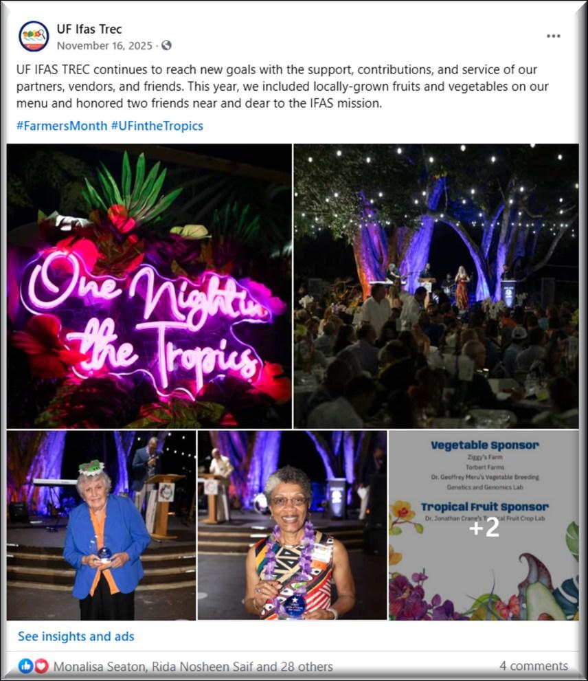The crowd heard from the UF/IFAS TREC Center Director Dr. Edward “Gilly” Evans, Dr. Kati Migliaccio, the Dean of the College of Agricultural and Life Sciences, Heather Moehling, President of the Dade County Farm Bureau, and Sudeep Adhikari, President of the South Florida Graduate Student Organization. The highlight of the event though was Dr. Pauline O. Lawrence sharing memories of her upbringing, experiences at the UF/IFAS Tropical Research & Education Center, and early career.
