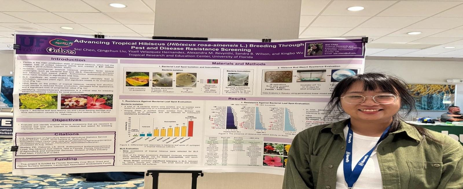 Sisi Chen, a PhD student in Dr. Xingbo Wu’s tropical plant breeding and genetics lab, won first place in the graduate student competition at the IPPS Southern Region Conference in Orlando. Sisi was one of four students invited to participate based on the merit of her conference proceedings. Her presentation, “Advancing tropical hibiscus breeding through pest and disease resistance screening” was funded by FDACS