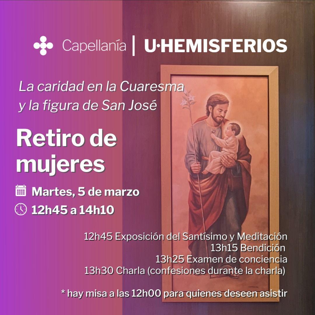 La Universidad Hemisferios extiende una cordial invitación a participarenelRetirodeMujeres deestemes,centradoeneltema "La caridad en la Cuaresma y la figuradeSanJosé".Esteevento será una experiencia enriquecedora y edificante para todas aquellas que deseen profundizar en su crecimiento espiritual y reflexionar sobre temas relevantes en la vida cristiana.