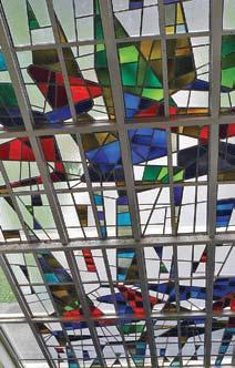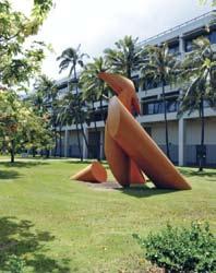 In 1959, Hawai‘i’s statehood year, Keller Hall was erected to house the engineering and mathematics departments. Named in honor of the many contributions of Arthur Keller, Keller Hall was designed by Clifford F. Young. The builder was Edwin M. Tani, a 1949 graduate in engineering. Distinguishing this four-story reinforced concrete structure are striking stained glass windows, 12 feet wide and three stories high, designed by art professor Murray Turnbull and his wife Phyllis. Concerning these works the artists wrote, “The principal purpose of the colored glass was to provide an opening of space and a life of color and light in the otherwise enclosed boxlike spaces of the building. No story or symbolism was involved; the basic intention was to enrich the lighting and character of spaces which were to be primarily functional.”