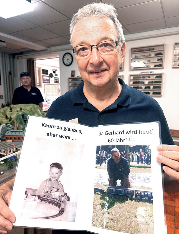 Seine Freunde vom Verein haben ihm das Bild zu seinem 60. Geburtstag vergrößert, denn auch Jahrzehnte später ist die Leidenschaft mindestens so groß wie damals. Insgesamt hat der Verein 30 eingetragene Mitglieder, ein Drittel davon baut aktiv an der Anlage in der Schusterbeckstraße 17 mit. Und jedesmal, wenn die Einschaltknöpfe auf den einzelnen Anlagen, die mit viel Liebe zum Detail gestaltet sind, auf „On“ gehen, ist es für die eingeschworene Truppe zugleich eine Reise in die Vergangenheit als auch in die Zukunft.
