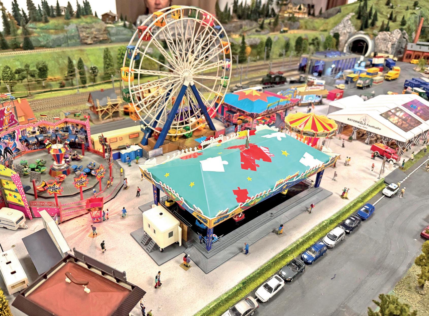 Eine Anlage hat eine Wechselplatte, auf der sich die Tüftler mit immer wieder neuen, filigran gearbeiteten Besonderheiten austoben können. Dass die im Kleinstformat auf dem Bauernhof aufgebauten Hühner auch noch nach Körnern picken können, wenn die Eisenbahner symbolisch Futter über der Anlage ausstreuen, kann man sich gar nicht vorstellen. Selbst beim Hinsehen braucht man fast eine Lupe und dennoch funktioniert alles einwandfrei. Aktuell ist das aufgebaute Volksfest ein absoluter Hingucker, sogar die kleinen Autoscooter können gesteuert werden, das beleuchtete Riesenrad dreht sich und man kann sich beim Betrachten