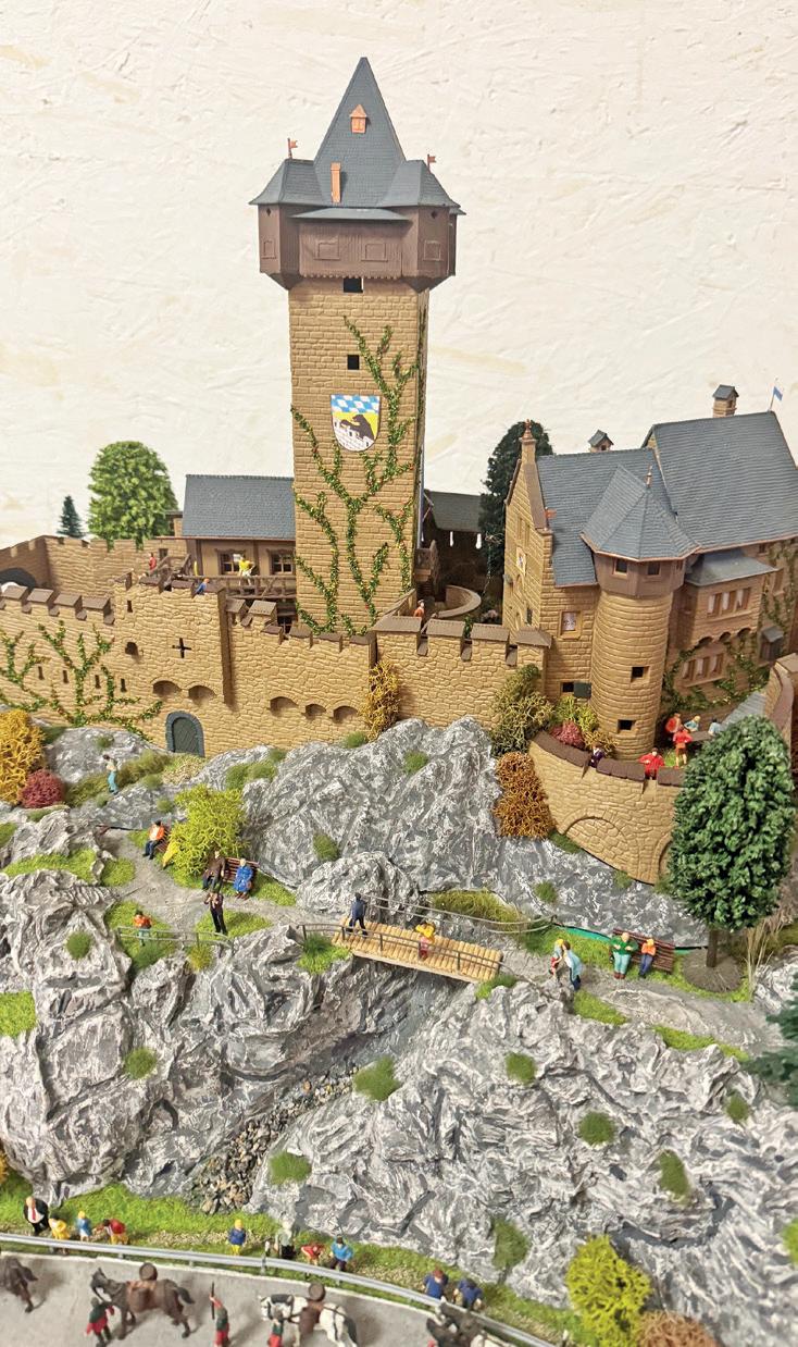 Die nachgebaute Landschaft unterhalb der Burg bietet viele Details mit Bezug zu Grafenau, wie etwa den nachgebauten Säumerzug oder den Kurpark. „Nicht fehlen darf natürlich Bärtl Bär“, sind sich die Eisenbahnfreunde einig. Das Grafenauer Wappentier ist mehrfach in den Räumen verewigt, auf der Anlage schmeißt der Bär direkt unterm Maibaum Bonbons für die Kinder aus.