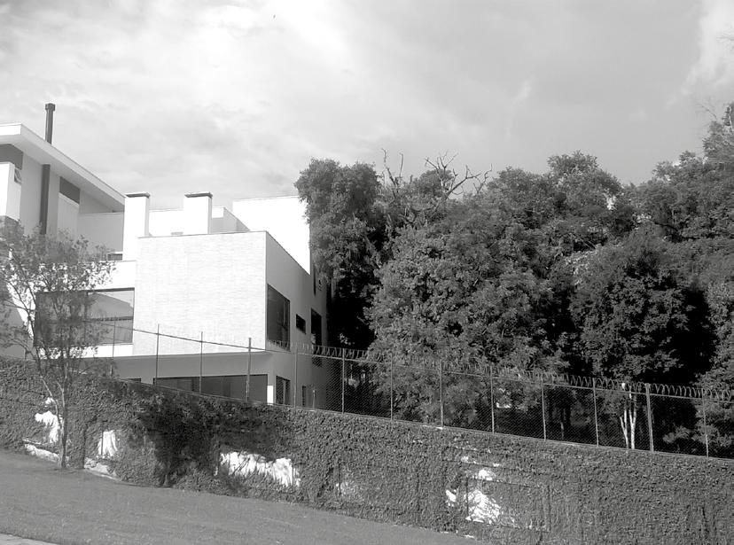 - el terreno con un desnivel de 5m y una pendiente de 25%, localizado en el borde de un condominio cerrado, limitado al frente por una calle interna, al fondo por una calle pública y lateralmente por un bosque protegido.