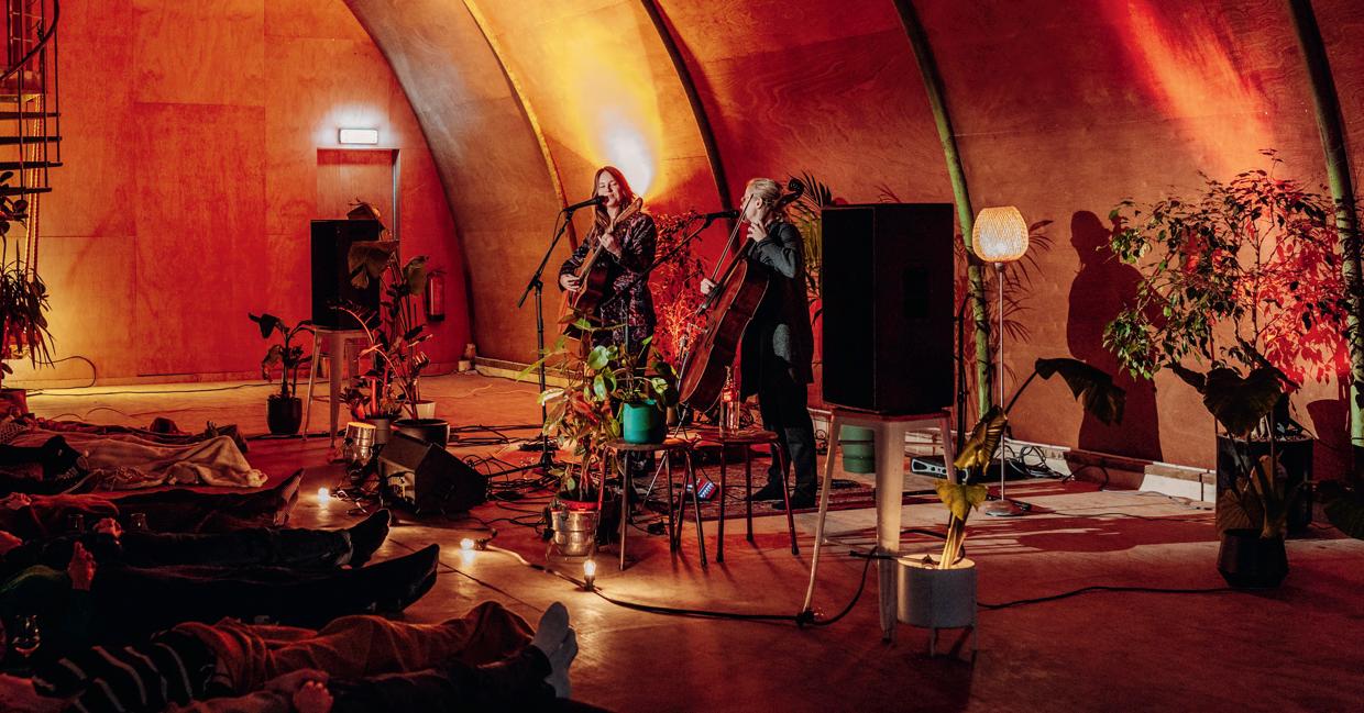 Terwijl de regen op het dak roffelt, rollen de bezoekers van Klankmat hun matjes uit om te genieten van het maandelijkse ligconcert in Vogelfrei. Een sfeerverslag. We rolled out our yoga mat at the monthly Klankmat ‘lie-down-concerts’ in Vogelfrei.