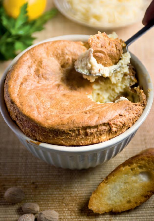 9 Stort het mengsel in de bakvorm en bak 35 minuten in een oven met warmeluchtcirculatie op 180 °C. Door de circulatie van de warme lucht zal de soufflé gaan rijzen. Als je hem alleen bovenen onderaan verwarmt, zal hij minder goed opkomen.