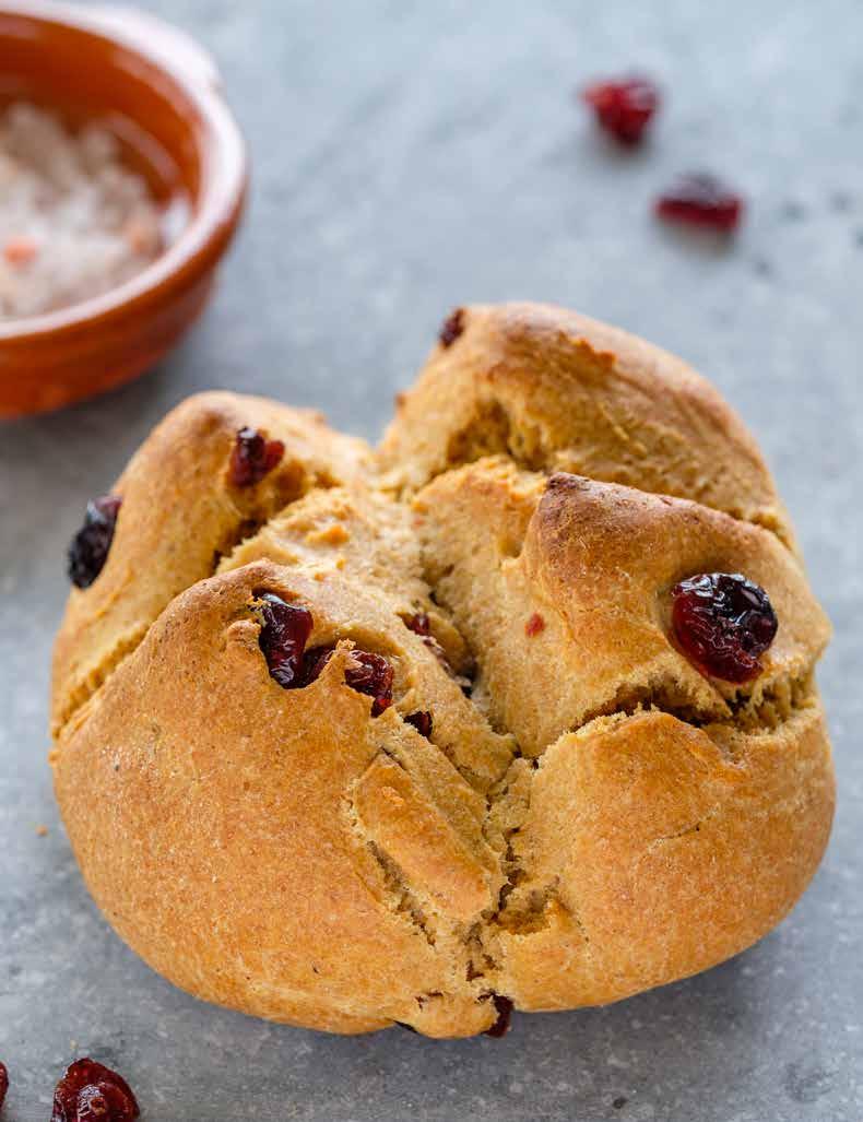 Placez dans un grand bol la farine tamisée, la poudre à lever, le sel et le beurre en morceaux. Émiettiez avec vos doigts afin d’obtenir un mélange sableux. Rajoutez le yaourt, le lait et le miel. Mélangez et formez une boule de pâte bien lisse. Divisez-la en deux, formez deux boules et placez sur une feuille de papier cuisson légèrement farinée. Étalez légèrement, déposez les canneberges, roulez à nouveau pour obtenir des pâtons d’environ 15 cm de diamètre.