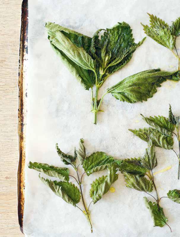 Bereiden: leg de brandnetels op bakpapier, besprenkel ze met olijfolie en zout en leg onder de grill tot ze droog en knapperig zijn.