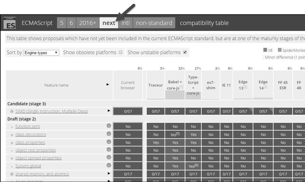 Kiesbovenindetabeleenanderversienummer(bijvoorbeeld 2016+ofnext)omtezienwelkenieuwemogelijkhedenvoorde toekomstzijnvoorgesteldenhoedeondersteuningvanbrowsers enandereomgevingenopditmomentis.Waarschijnlijkknalteen tabelmetallemaalrodevakjesutegemoet.Dezeondersteuning wordtindeloopderjareningebouwd,metelkenieuwebrowserofruntime-versie.