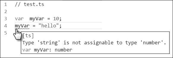 UweetwaarschijnlijkdatallesinJavaScriptvan hettype var is.Allevariabelenzijn loosely typed.Umageenstatementschrijvenals var myVar=‘Hello’ (myVarisnuimplicietvanhet type string ).Verderopmaguvervolgensschrijven myVar=10 (nuis myVar vanhettype number ).InJavaScriptisditvollediggeaccepteerd. TypeScriptzalerechterovervalleneneencompiler-errorlatenzien.Hetscriptzalwelwerken, maarwaarschijnlijkishetongewenstdateen variabeledeenekeereenstringendeandere keereennummerbevat.TypeScriptcontroleert ditsoortzakenenwaarschuwtu.Dooralleende bestandsextensieaantepassenvan *.js naar *.ts wordtualopditsoortfoutengewezen.U hoeftergeenregelcodevooraantepassen.