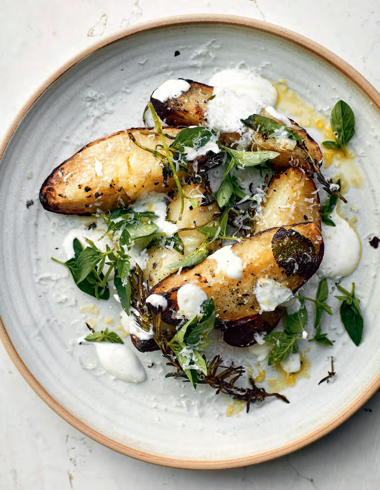Stort de aardappels op een bord. Serveer met de hüttenkäse, verse kruiden en de parmezaan. Sprenkel er ten slotte nog een beetje olijfolie over en serveer de aardappels terwijl ze nog warm zijn, zodat de topping smelt.