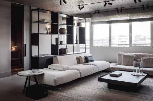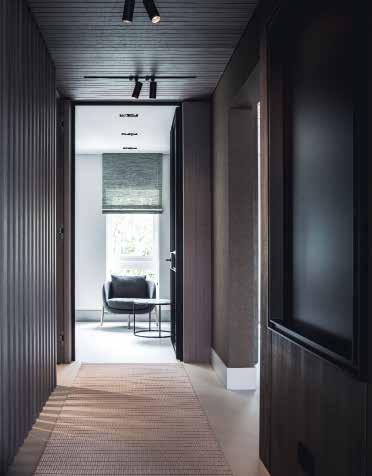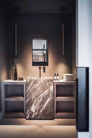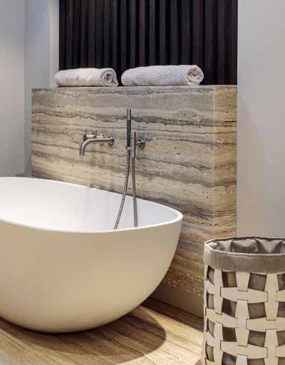 wooden blinds and have a semi-open connection to individual bathrooms via crafted niches, encouraging the circulation of air and light. The bedroom floors are clad in a striking herringbone-patterned Sequoia marble which feels satiny underfoot. Headboards and night tables were designed by Wolterinck. The bathrooms are finished with Beton Ciré, a textured concrete.