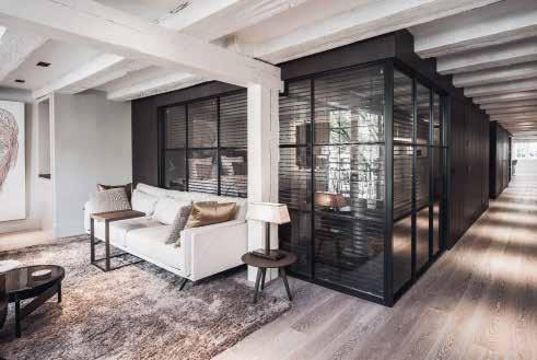 Working with the omnipresent beams and pillars presented special challenges. The lighting plan was extensive. Wolterinck measured the spaces between every beam by hand. The glass walls of the bedrooms were built around structural pillars. To house the pipes to and from the fireplace an extra-thick false wall was constructed.