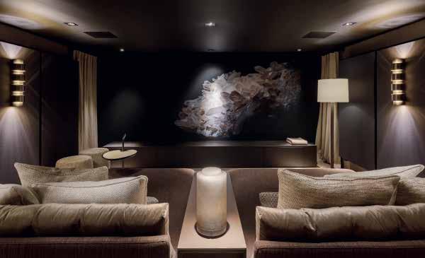 Unusually for this village, the house had a full upper level and a vast basement. Small differences in levels helped to define spaces for a bar, a pool table, a television room, and a dedicated media room. The husband is an avid music lover. A high fidelity “listening” room was created that would approximate the feeling of a live performance. Wolterinck sought out audio expertise, installing the best equipment and furnishing the retreat with luxurious daybeds and lush fabrics in sensuous browns. The wife is a semi-professional cook. There is a state-of-the-art kitchen and a long, striking dining table of wood and bronze, ready for festive meals.